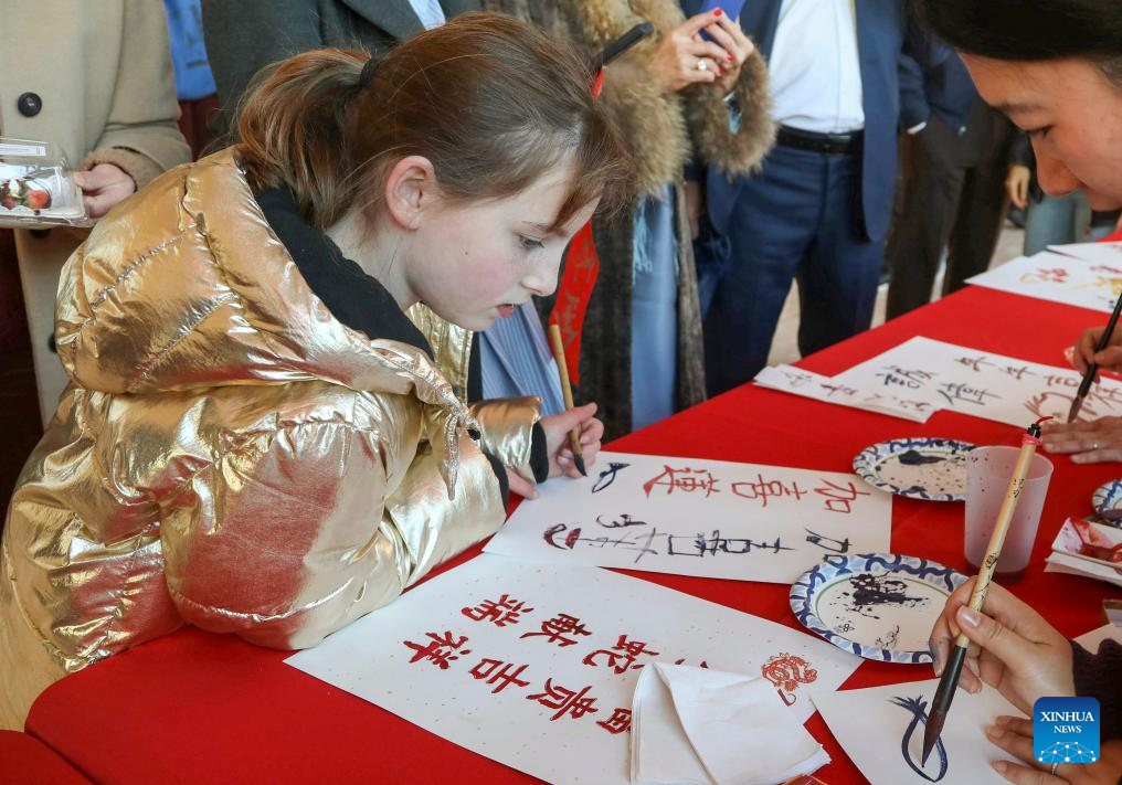 A girl tries Chinese calligraphy at Davies Symphony Hall, where a concert is held in celebration of the Chinese New Year, in San Francisco, California, the United States, Feb. 8, 2025. (Photo by Liu Yilin/Xinhua)