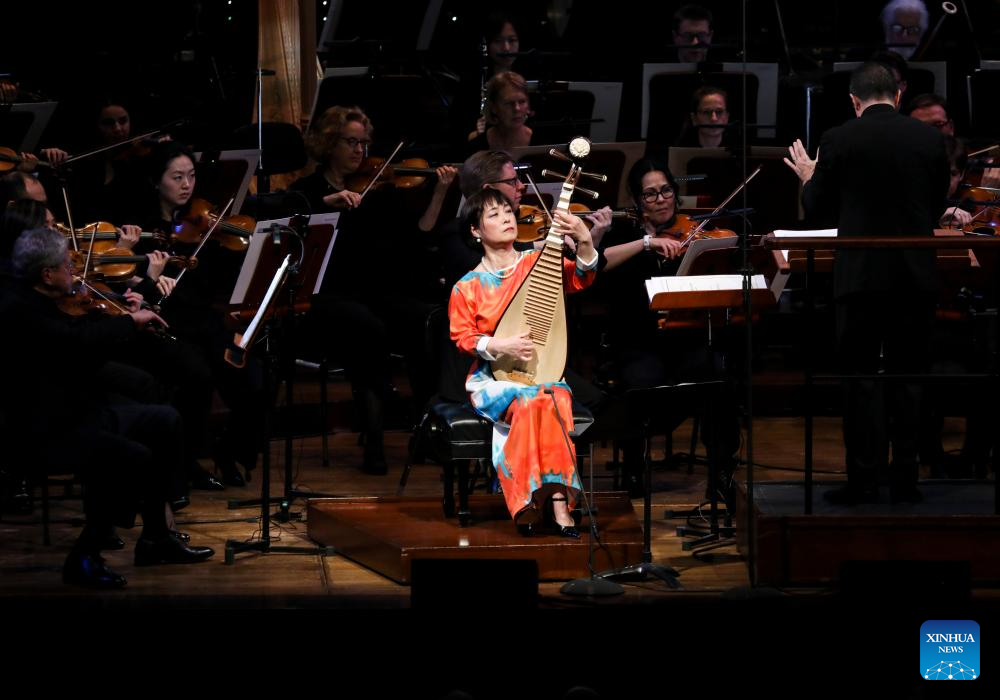Pipa virtuoso Wu Man (C) performs during a concert in celebration of the Chinese New Year at Davies Symphony Hall in San Francisco, California, the United States, Feb. 8, 2025. (Photo by Liu Yilin/Xinhua)