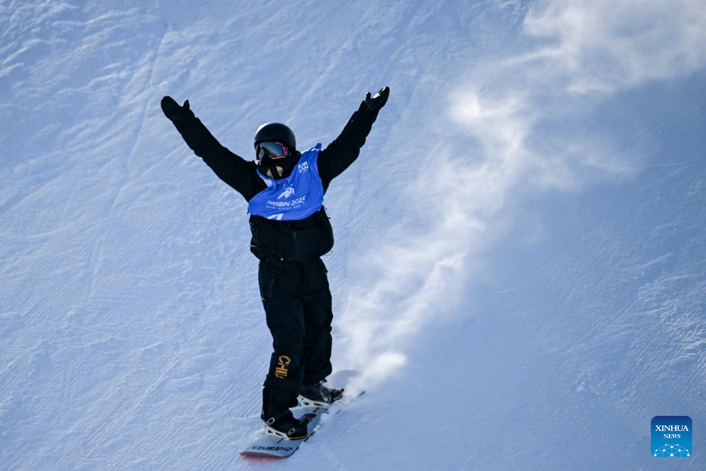 Jiang Xinjie of China competes during the men's snowboard big air final match at the 9th Asian Winter Games in Yabuli, northeast China's Heilongjiang Province, Feb. 10, 2025. (Xinhua/Mu Yu)