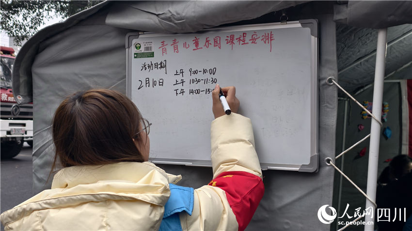 A volunteer writes a class schedule on a whiteboard at a temporary shelter built in a school in Junlian county, Yibin city, southwest China's Sichuan Province. (People's Daily Online/Zhao Zule)