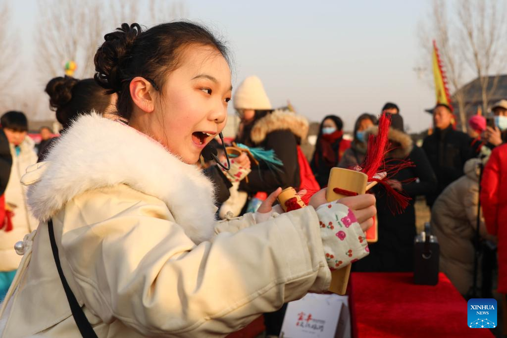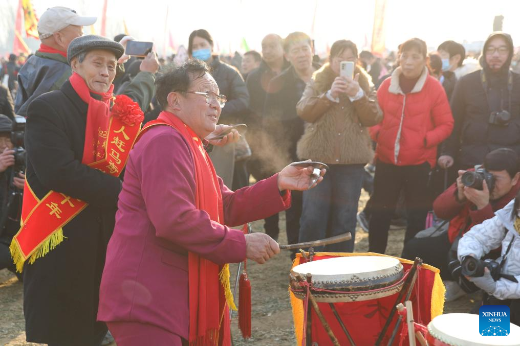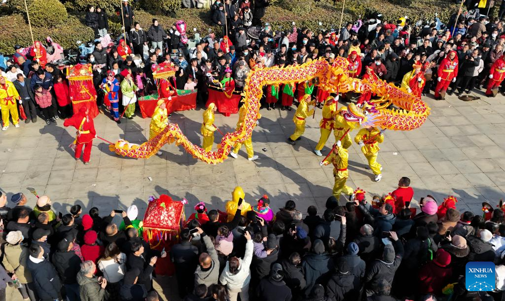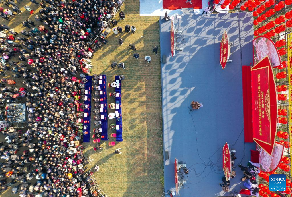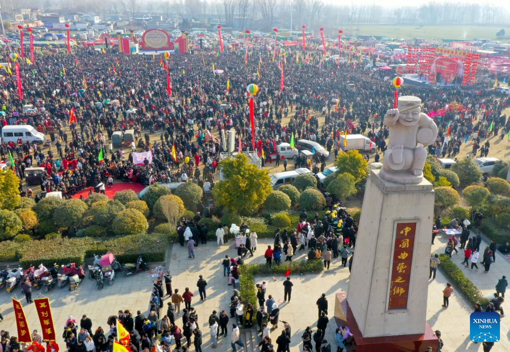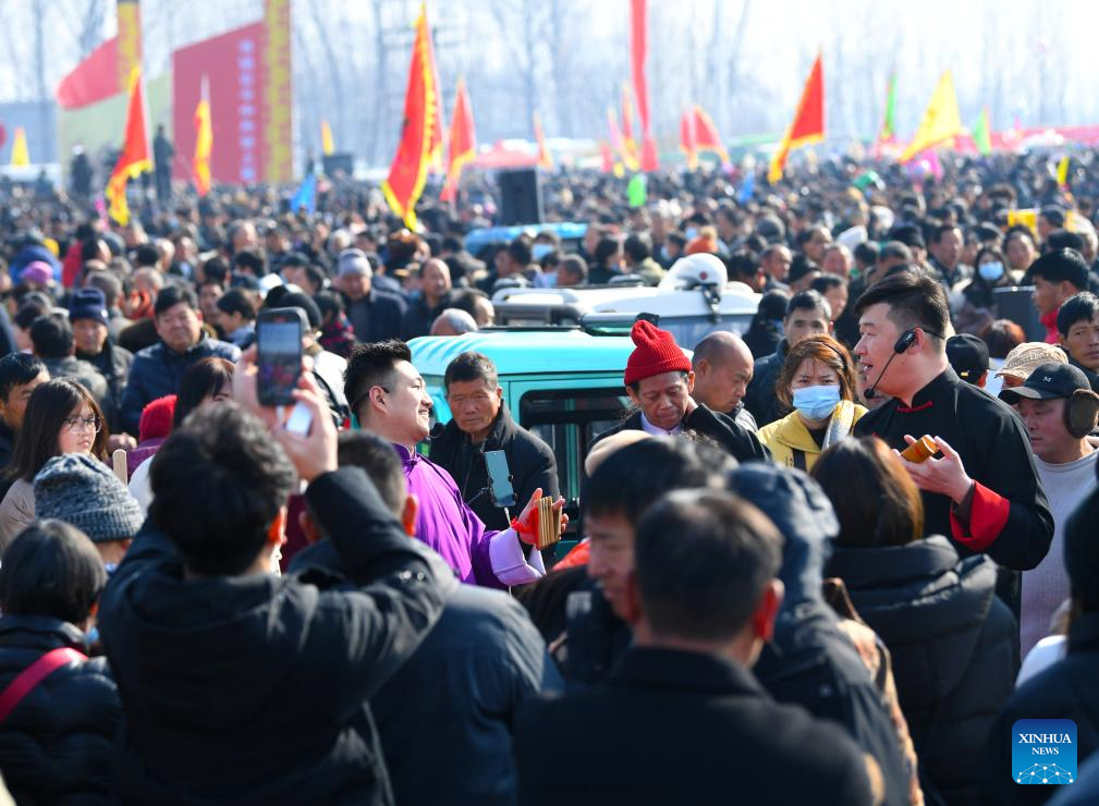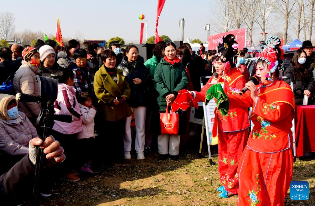 This photo shows a view at the Majie Quyi Fair in Majie Village of Baofeng County, central China's Henan Province, Feb. 10, 2025. On Monday, the 13th day of the first month on Chinese traditional calendar, a grand feast of Quyi unfolded in the wheat fields of Majie Village. Quyi, meaning Chinese folk arts, refers to various narrative and singing forms including ballad singing, comic dialogues, clapper talk and crosstalk, which remain popular among the Chinese people. The Majie Quyi Fair, with a history of over 700 years, was inscribed on the first national intangible cultural heritage list in 2006. (Xinhua/Hao Yuan)