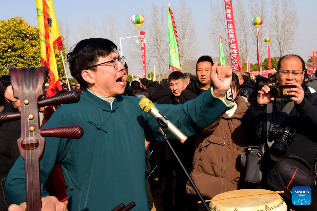 A folk artist performs during the Majie Quyi Fair in Majie Village of Baofeng County, central China's Henan Province, Feb. 10, 2025. On Monday, the 13th day of the first month on Chinese traditional calendar, a grand feast of Quyi unfolded in the wheat fields of Majie Village. Quyi, meaning Chinese folk arts, refers to various narrative and singing forms including ballad singing, comic dialogues, clapper talk and crosstalk, which remain popular among the Chinese people. The Majie Quyi Fair, with a history of over 700 years, was inscribed on the first national intangible cultural heritage list in 2006. (Xinhua/Zhu Xiang)