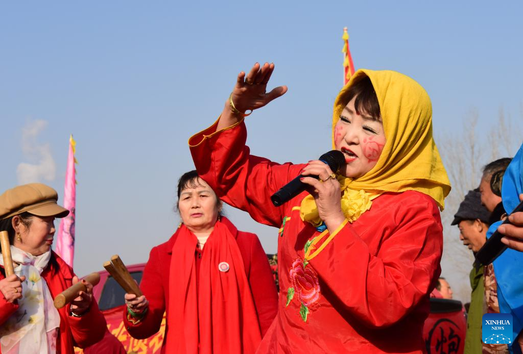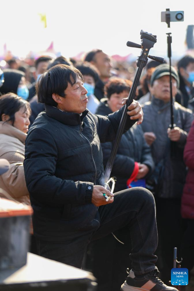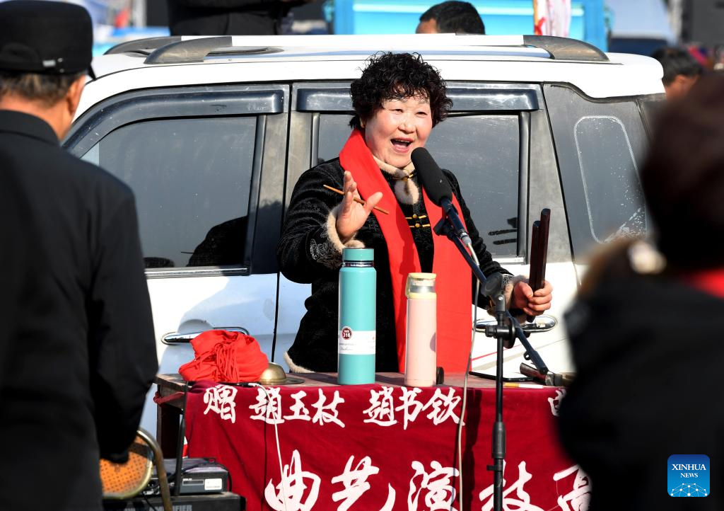 A folk artist performs during the Majie Quyi Fair in Majie Village of Baofeng County, central China's Henan Province, Feb. 10, 2025. On Monday, the 13th day of the first month on Chinese traditional calendar, a grand feast of Quyi unfolded in the wheat fields of Majie Village. Quyi, meaning Chinese folk arts, refers to various narrative and singing forms including ballad singing, comic dialogues, clapper talk and crosstalk, which remain popular among the Chinese people. The Majie Quyi Fair, with a history of over 700 years, was inscribed on the first national intangible cultural heritage list in 2006. (Xinhua/Hao Yuan)