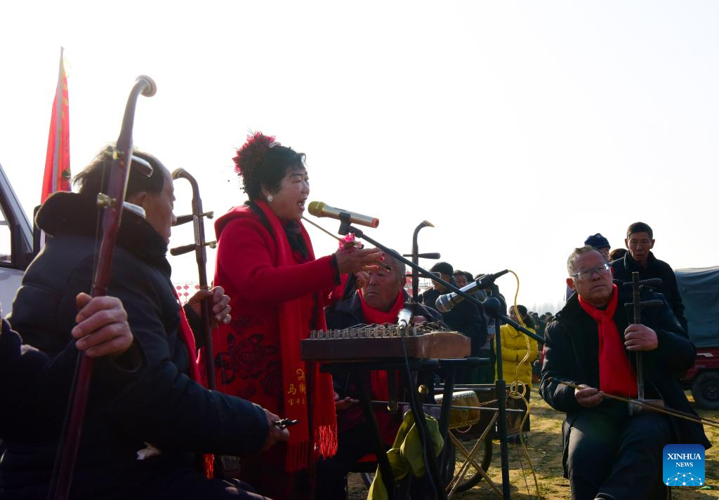 Folk artists perform during the Majie Quyi Fair in Majie Village of Baofeng County, central China's Henan Province, Feb. 10, 2025. On Monday, the 13th day of the first month on Chinese traditional calendar, a grand feast of Quyi unfolded in the wheat fields of Majie Village. Quyi, meaning Chinese folk arts, refers to various narrative and singing forms including ballad singing, comic dialogues, clapper talk and crosstalk, which remain popular among the Chinese people. The Majie Quyi Fair, with a history of over 700 years, was inscribed on the first national intangible cultural heritage list in 2006. (Xinhua/Zhu Xiang)