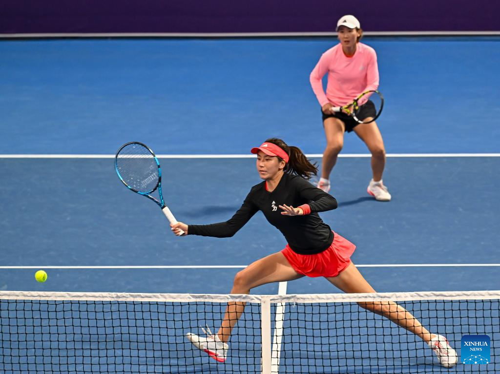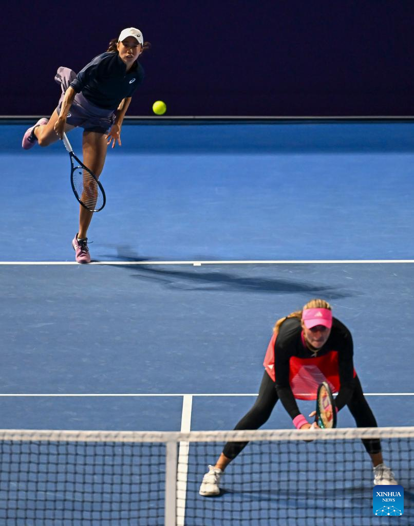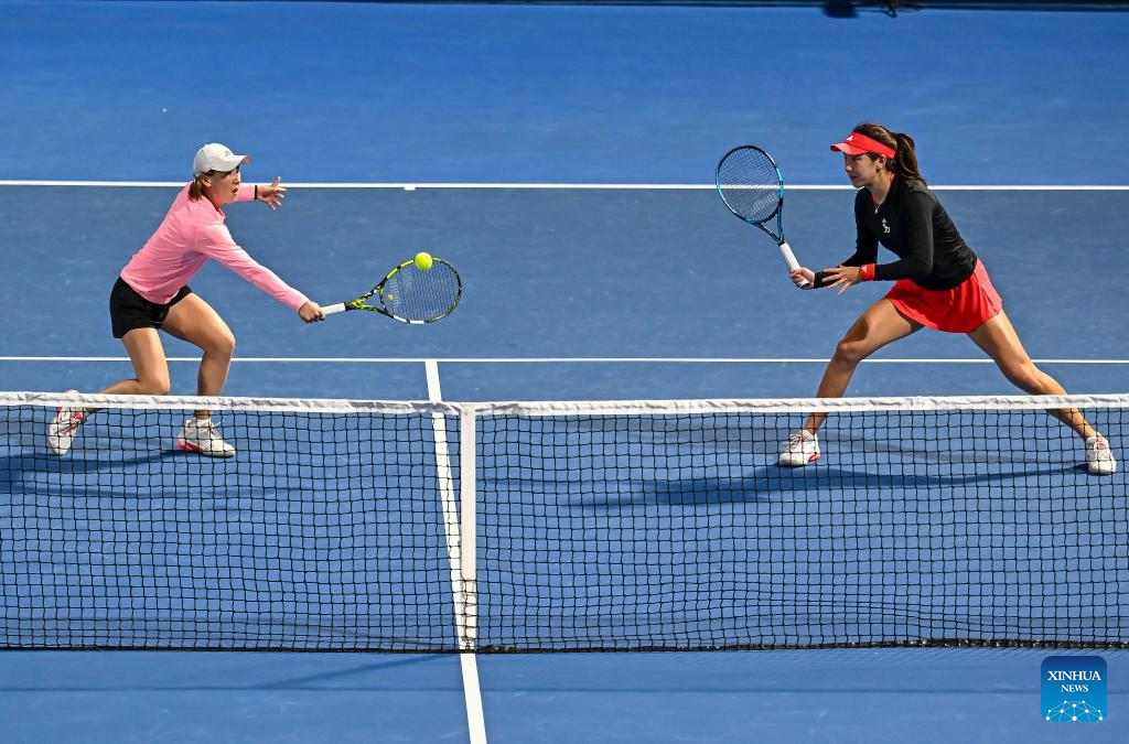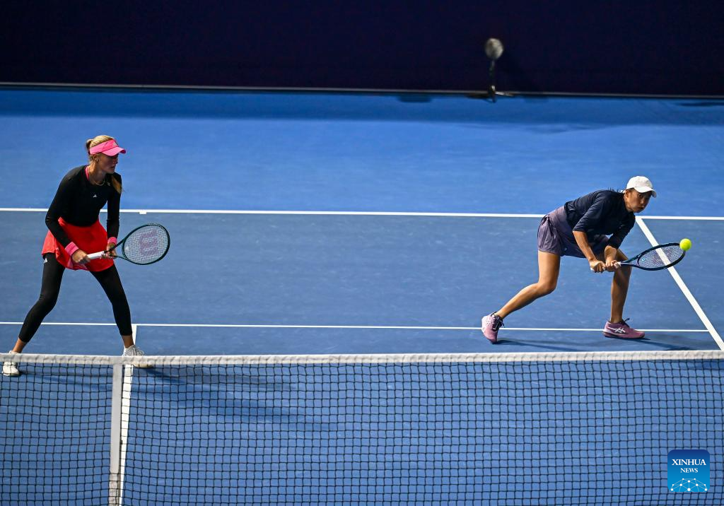 Wang Xinyu/Zheng Saisai (L) compete during the women's doubles round of 32 match between Elise Mertens (Belgium) /Ellen Perez (Australia) and Wang Xinyu/Zheng Saisai of China at the WTA Qatar Open tennis tournament in Doha, Qatar, on Feb. 10, 2025. (Photo by Nikku/Xinhua)