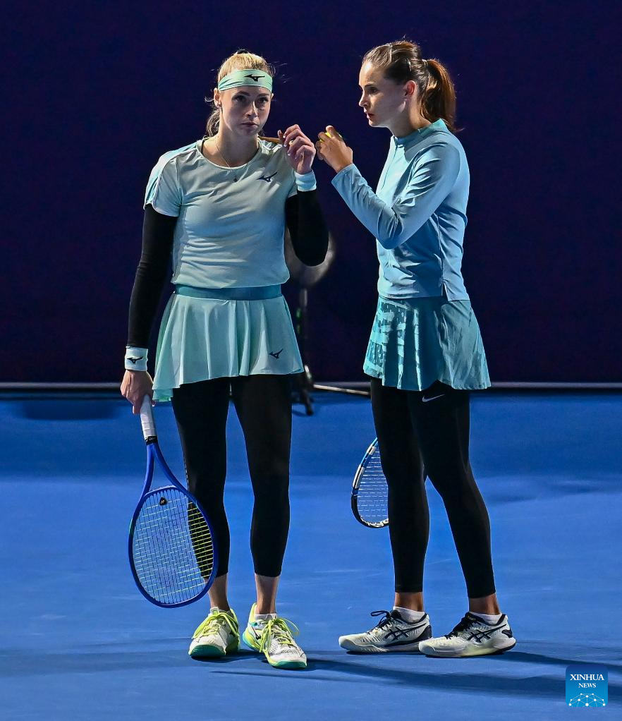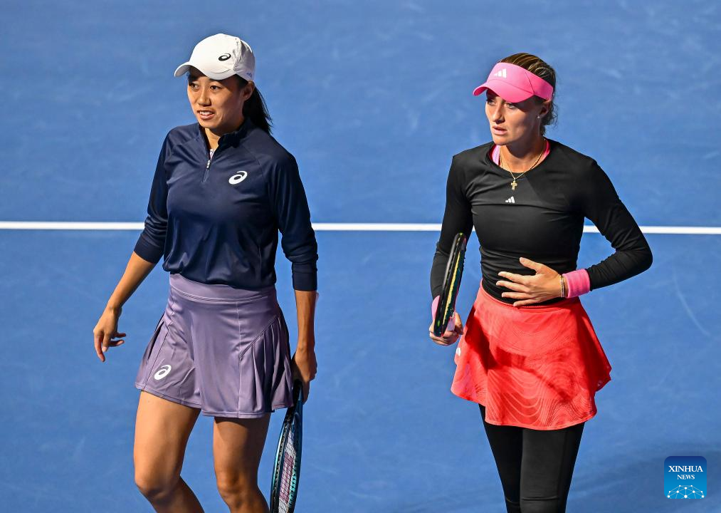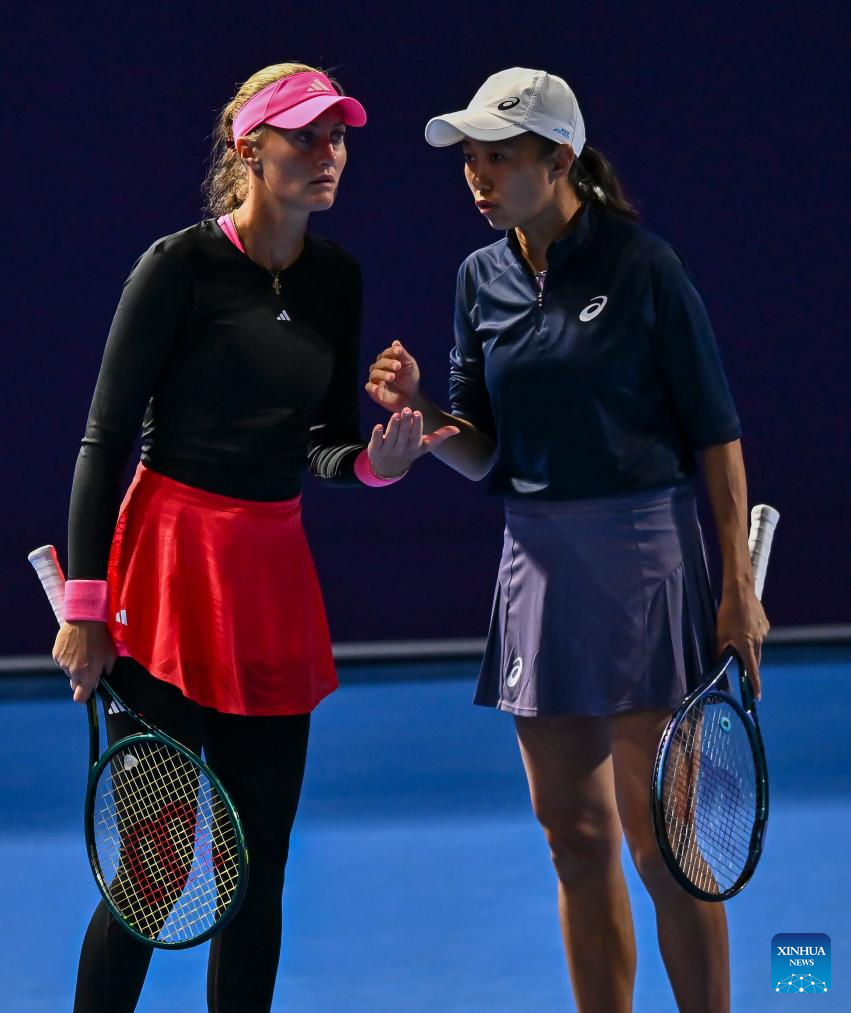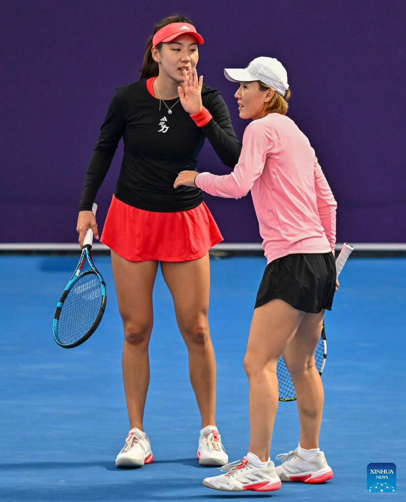 Wang Xinyu/Zheng Saisai (L) compete during the women's doubles round of 32 match between Elise Mertens (Belgium) /Ellen Perez (Australia) and Wang Xinyu/Zheng Saisai of China at the WTA Qatar Open tennis tournament in Doha, Qatar, on Feb. 10, 2025. (Photo by Nikku/Xinhua)