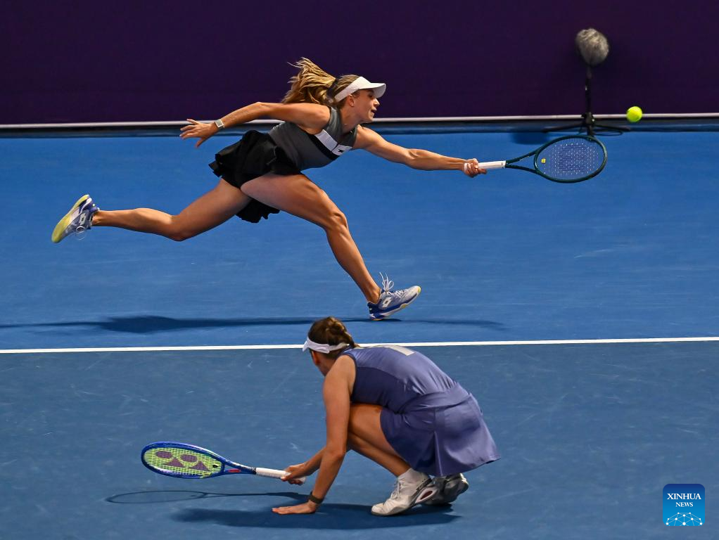 Wang Xinyu/Zheng Saisai (R) compete during the women's doubles round of 32 match between Elise Mertens (Belgium) /Ellen Perez (Australia) and Wang Xinyu/Zheng Saisai of China at the WTA Qatar Open tennis tournament in Doha, Qatar, on Feb. 10, 2025. (Photo by Nikku/Xinhua)