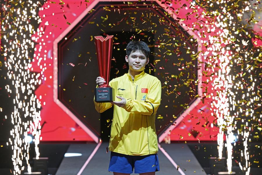 Lin Shidong celebrates after winning the men's singles final against compatriot Liang Jingkun at the 2025 World Table Tennis (WTT) Singapore Smash, Feb. 9, 2025. (Photo by Then Chih Wey/Xinhua)