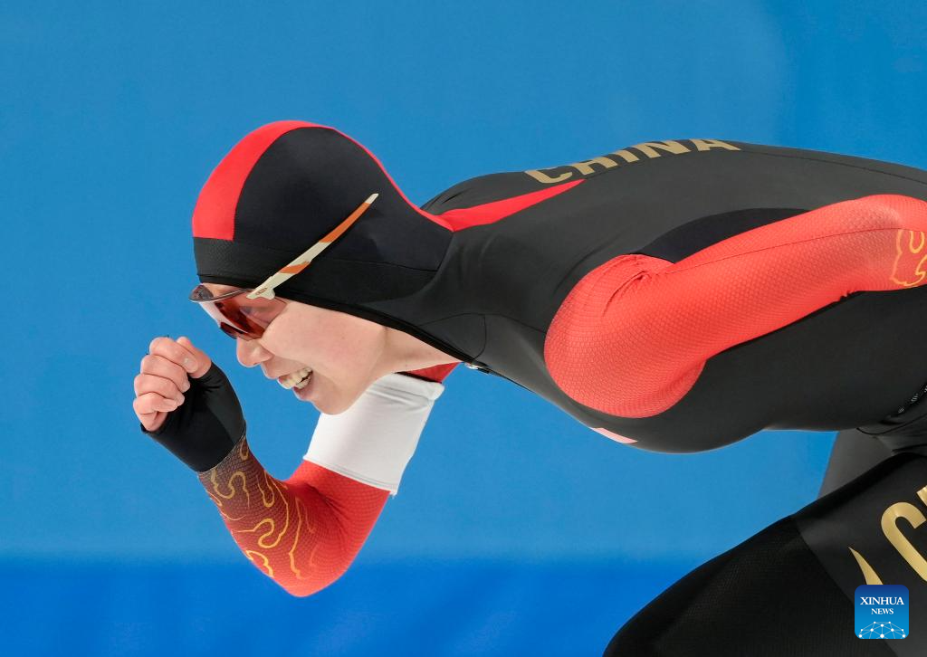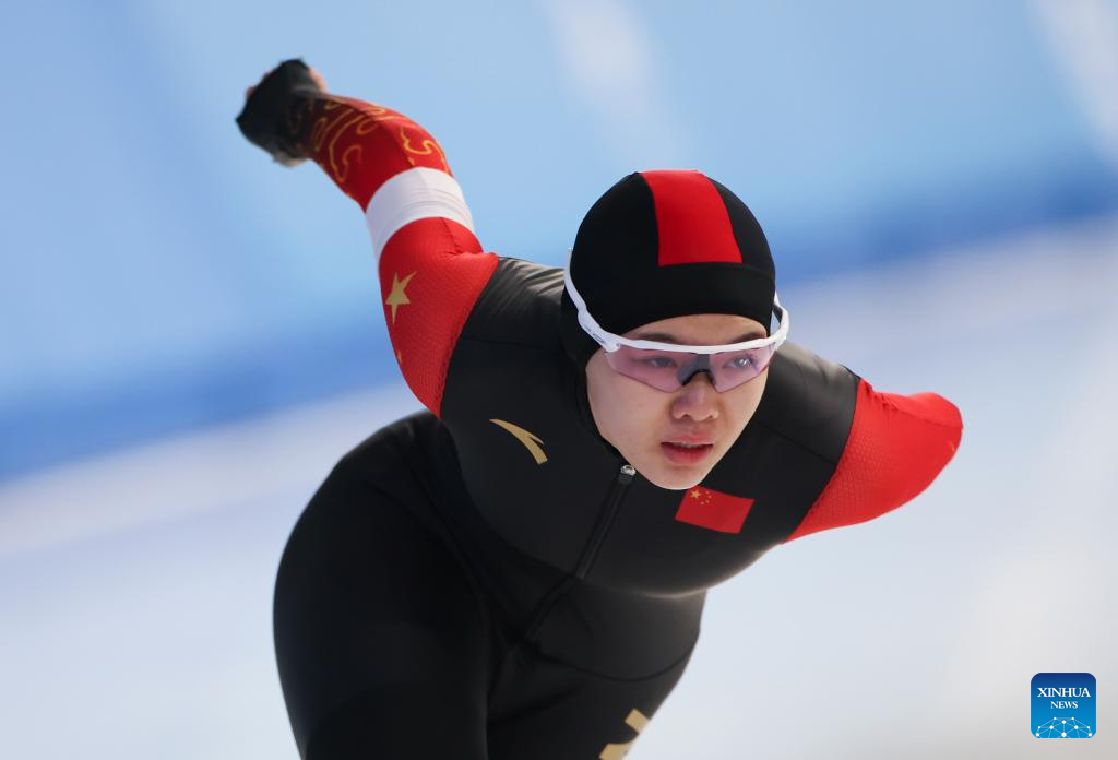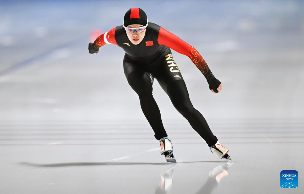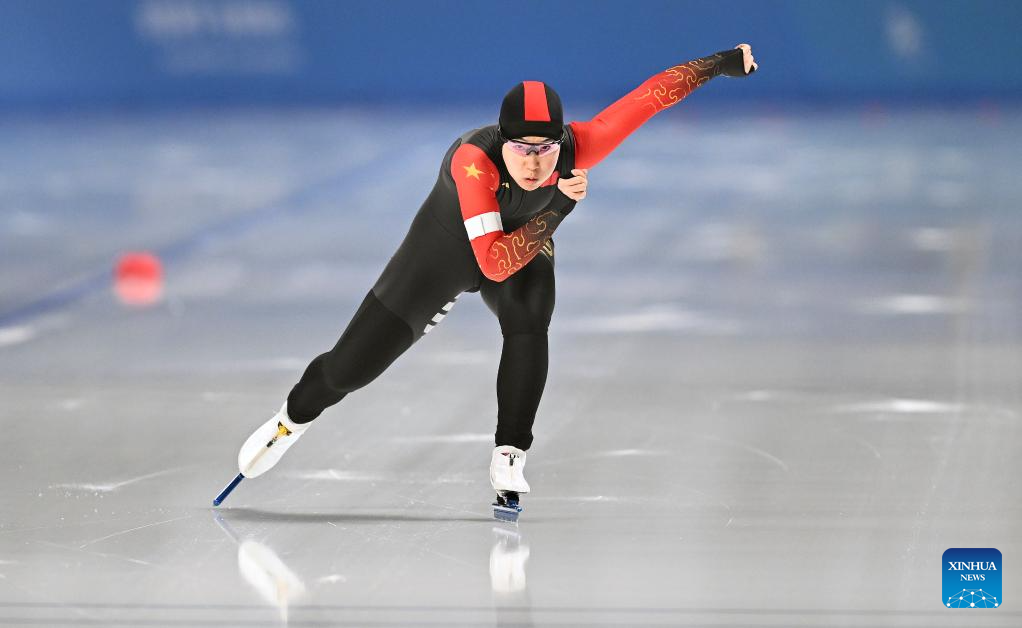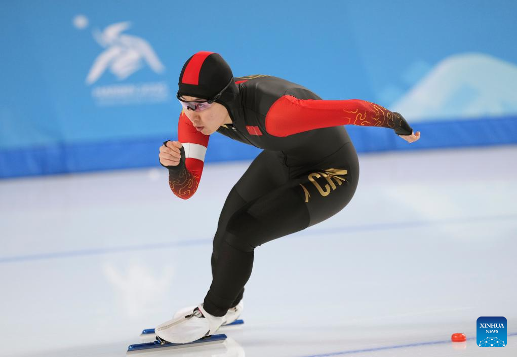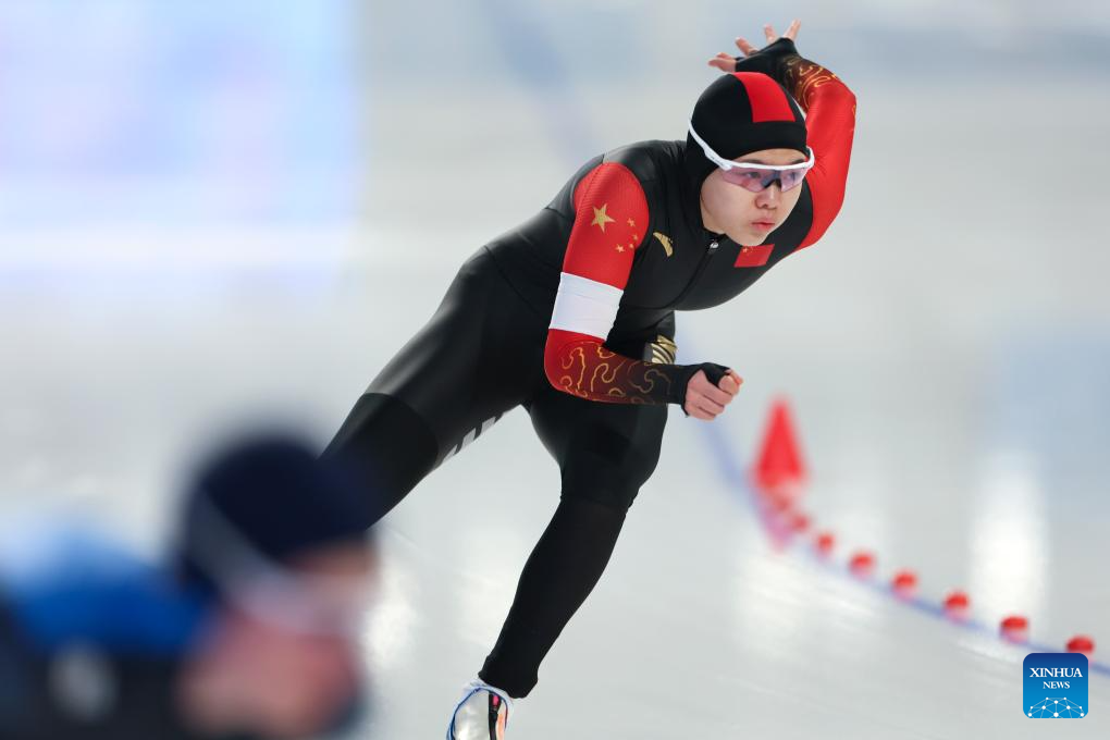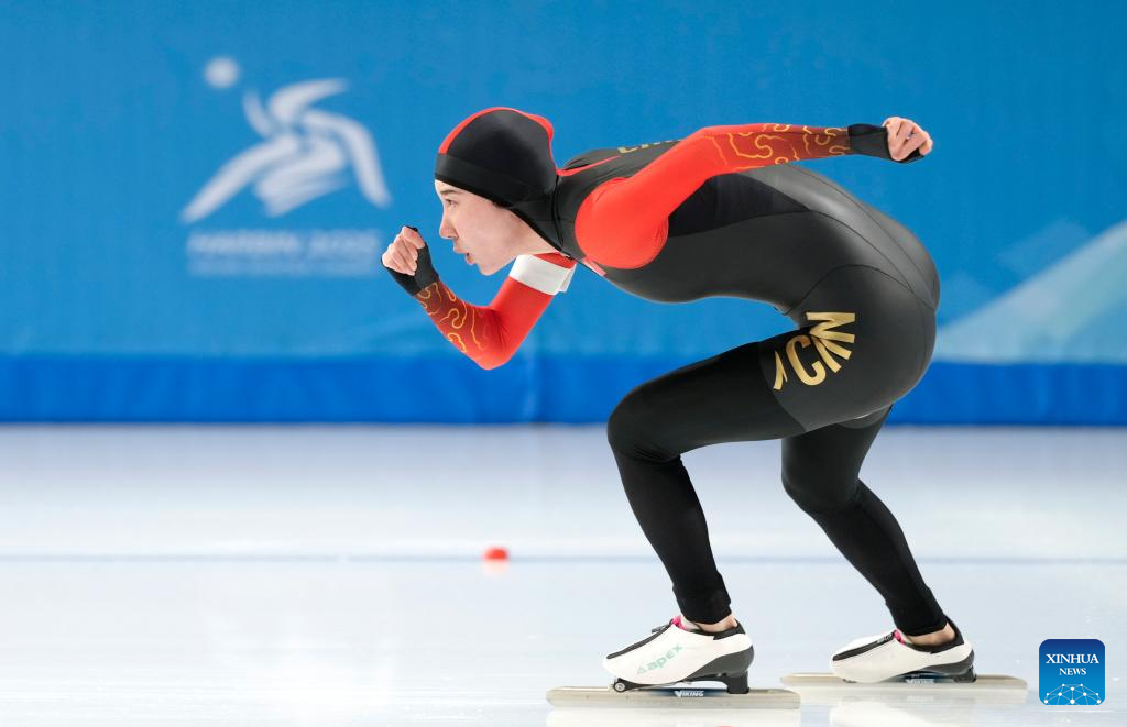 Yu Shihui of China competes during the women's 1000m final match of the speed skating event at the 9th Asian Winter Games in Harbin, northeast China's Heilongjiang Province, Feb. 11, 2025. (Xinhua/Wang Xi)