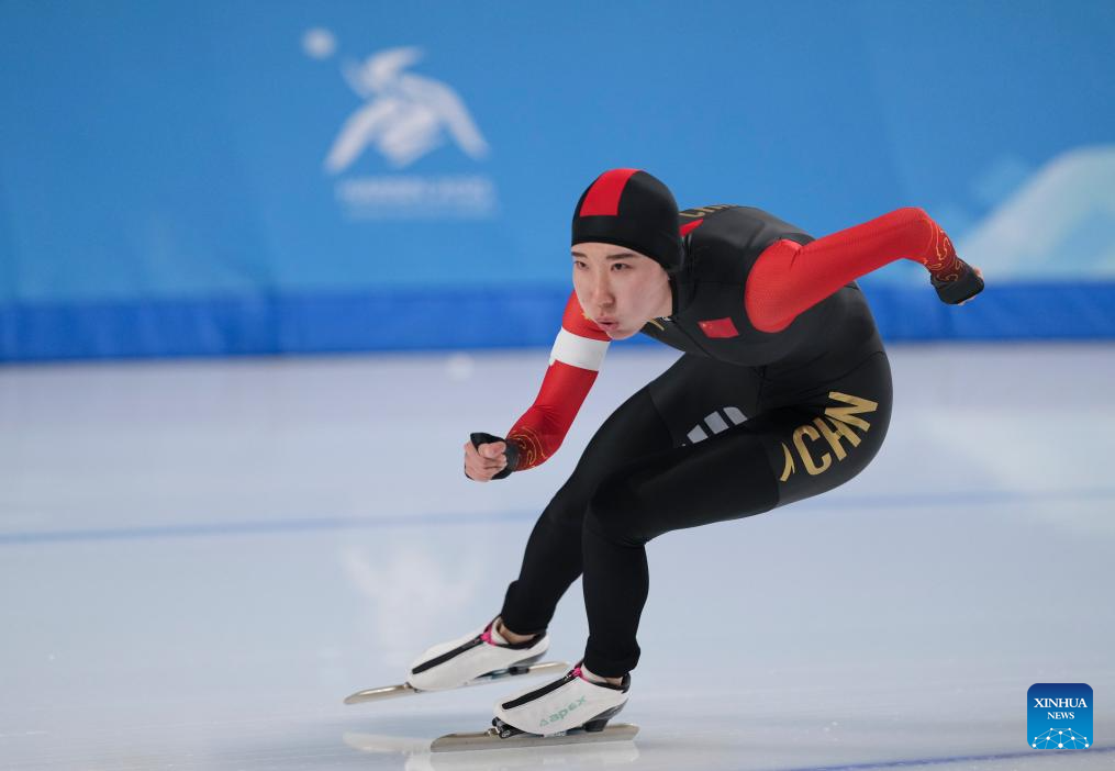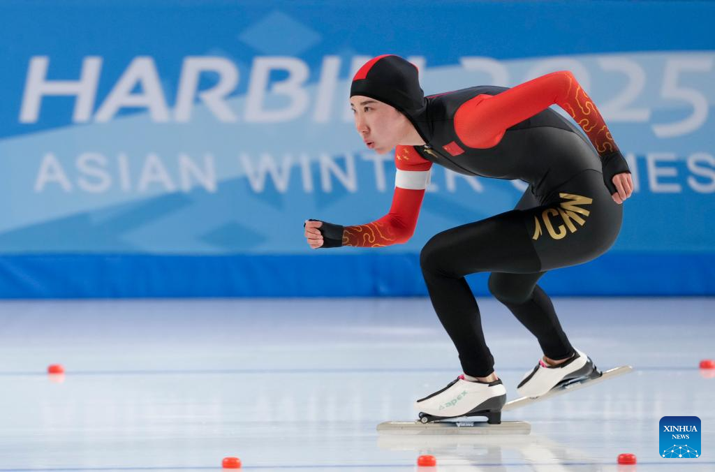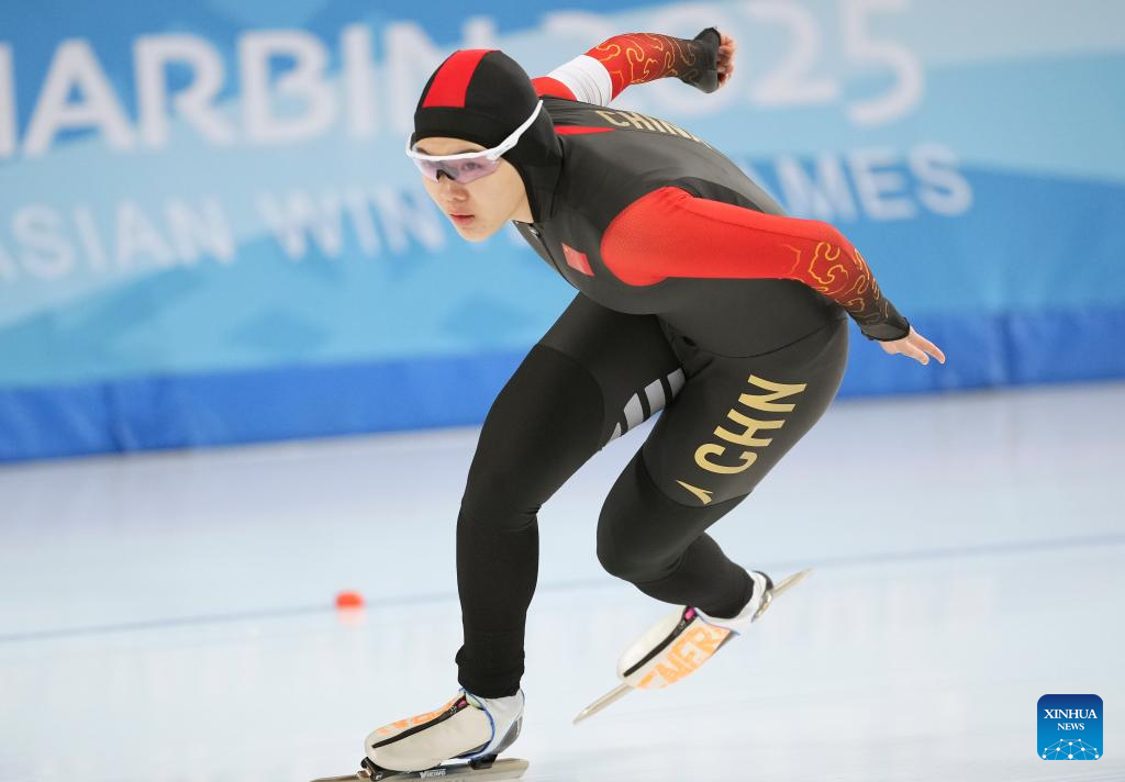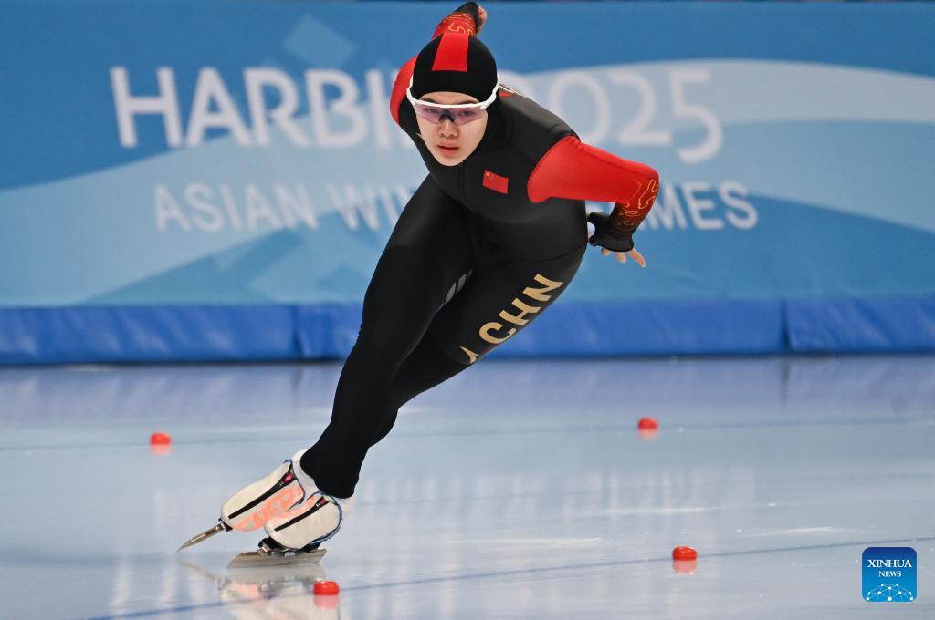 Yin Qi of China competes during the women's 1000m final match of the speed skating event at the 9th Asian Winter Games in Harbin, northeast China's Heilongjiang Province, Feb. 11, 2025. (Xinhua/Wang Jianwei)