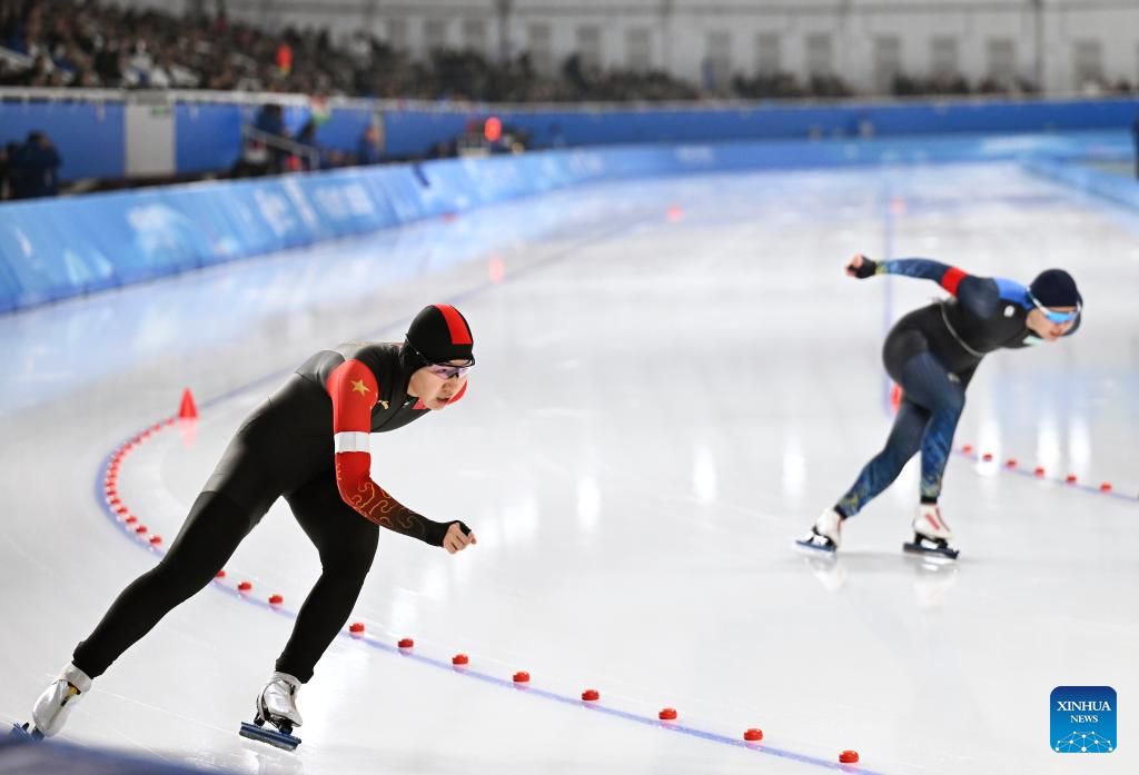 Han Mei of China competes during the women's 1000m final match of the speed skating event at the 9th Asian Winter Games in Harbin, northeast China's Heilongjiang Province, Feb. 11, 2025 (Xinhua/Wang Jianwei)