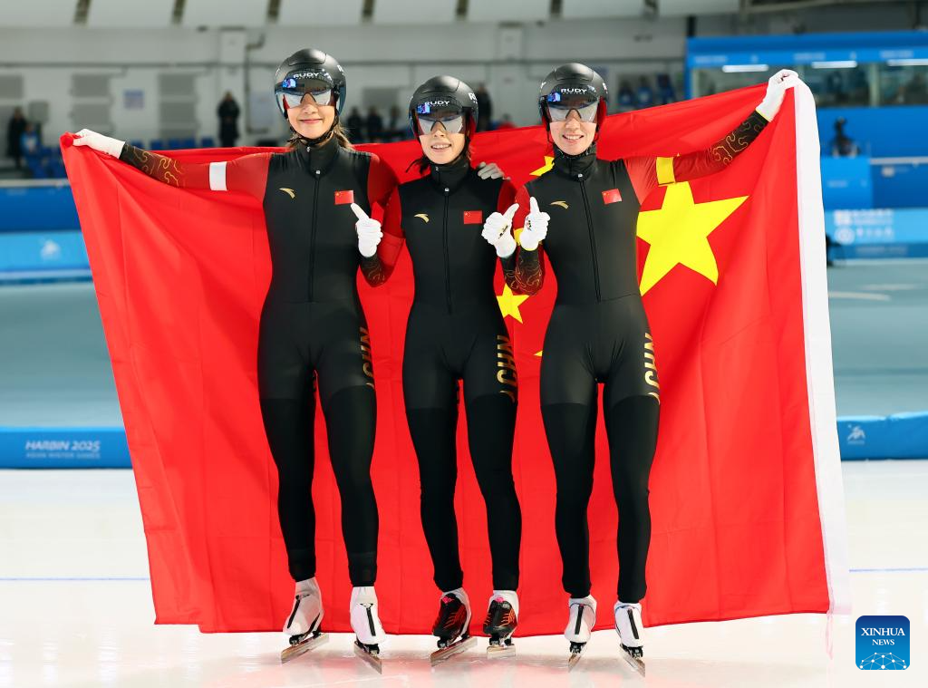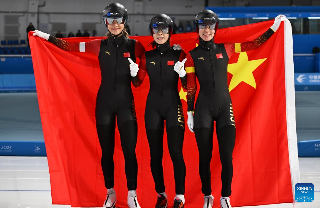 Yang Binyu (L), Ahenaer Adake (C) and Han Mei of China pose after the women's team pursuit of the speed skating event at the 9th Asian Winter Games in Harbin, northeast China's Heilongjiang Province, Feb. 11, 2025. (Xinhua/Wang Xi)