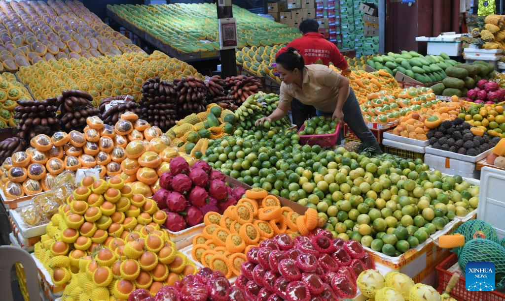 Vendors arrange fruits at a food market in Sanya, south China's Hainan Province, Feb. 11, 2025. (Xinhua/Zhao Yingquan)