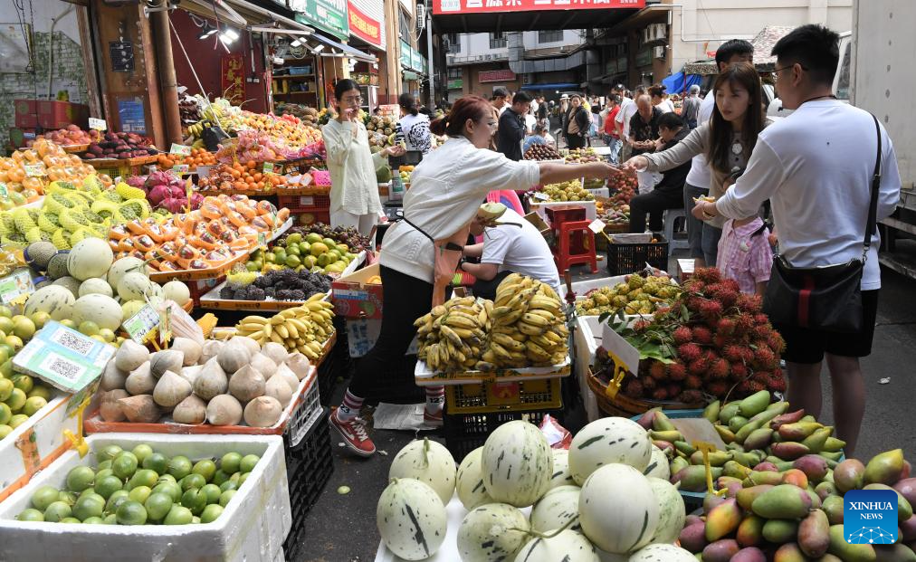 People buy fruits at a food market in Sanya, south China's Hainan Province, Feb. 11, 2025. (Xinhua/Zhao Yingquan)