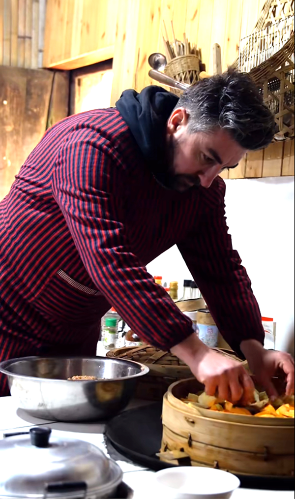 Burak cooks a dish in Luzhou city, southwest China's Sichuan Province. (Photo/Luo Senbo)