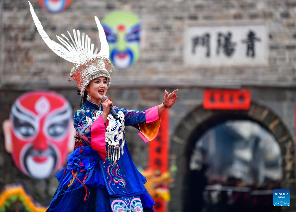 A singer of the Miao ethnic group performs during a Lantern Festival celebration at an ancient town in Jinping County, southwest China's Guizhou Province, Feb. 11, 2025. The celebration featured rich cultural elements of the Miao and Dong ethnic groups, both native to Guizhou. (Xinhua/Yang Wenbin)