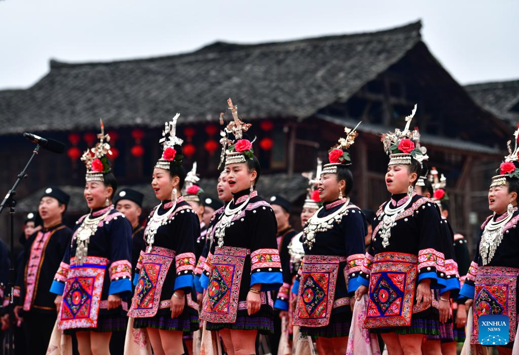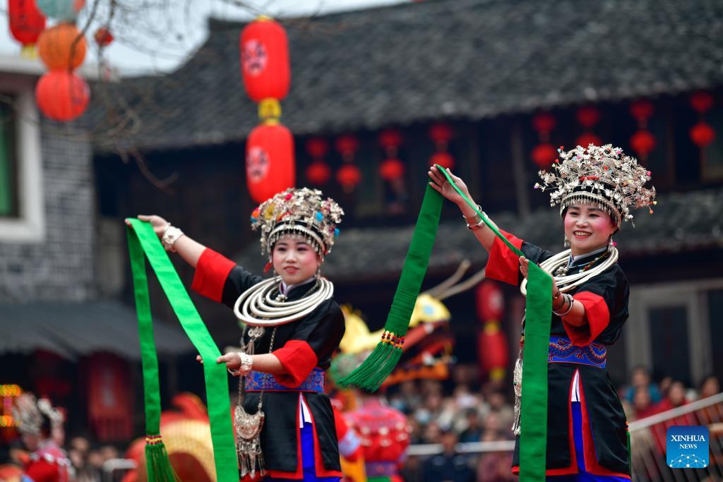 Performers sing ethnic songs during a Lantern Festival celebration at an ancient town in Jinping County, southwest China's Guizhou Province, Feb. 11, 2025. The celebration featured rich cultural elements of the Miao and Dong ethnic groups, both native to Guizhou. (Xinhua/Yang Wenbin)