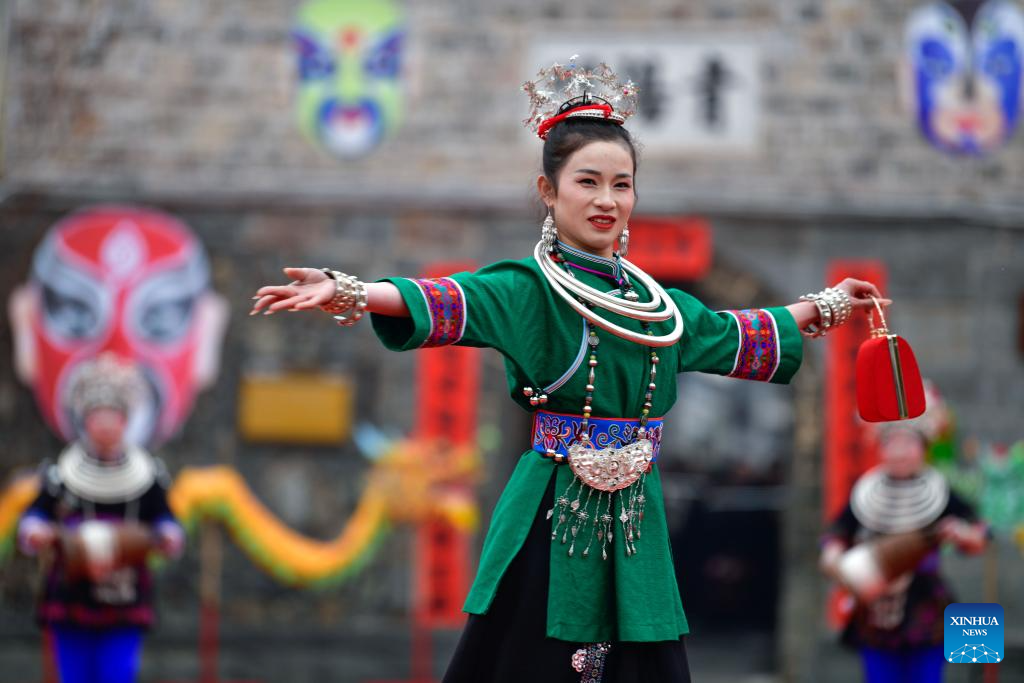 An actress presents ethnic costumes during a Lantern Festival celebration at an ancient town in Jinping County, southwest China's Guizhou Province, Feb. 11, 2025. The celebration featured rich cultural elements of the Miao and Dong ethnic groups, both native to Guizhou. (Xinhua/Yang Wenbin)