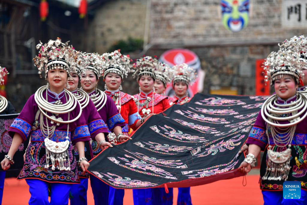Actresses present a piece of ethnic embroidery work during a Lantern Festival celebration at an ancient town in Jinping County, southwest China's Guizhou Province, Feb. 11, 2025. The celebration featured rich cultural elements of the Miao and Dong ethnic groups, both native to Guizhou. (Xinhua/Yang Wenbin)