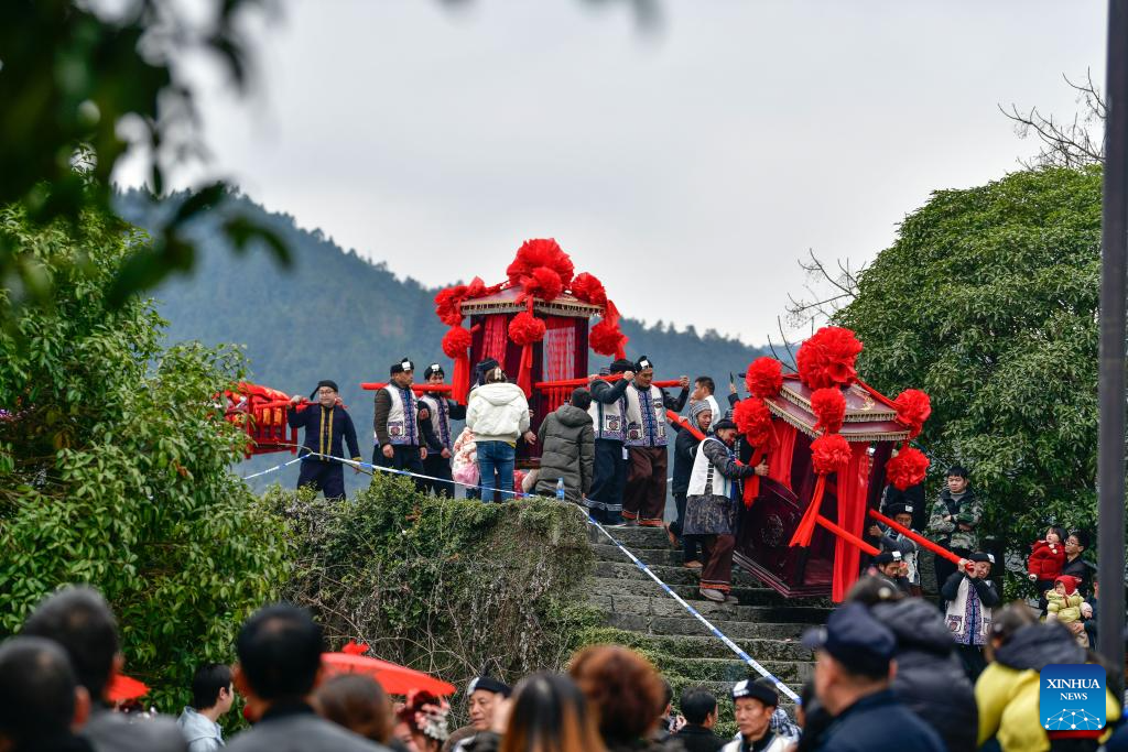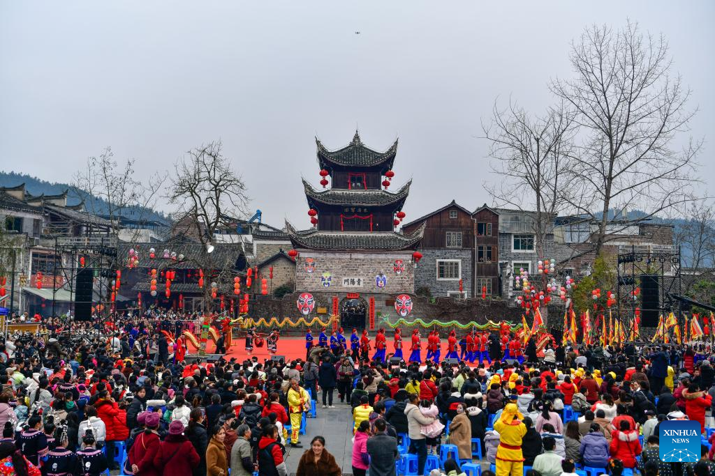 This photo shows a scene during a Lantern Festival celebration at an ancient town in Jinping County, southwest China's Guizhou Province, Feb. 11, 2025. The celebration featured rich cultural elements of the Miao and Dong ethnic groups, both native to Guizhou. (Xinhua/Yang Wenbin)
