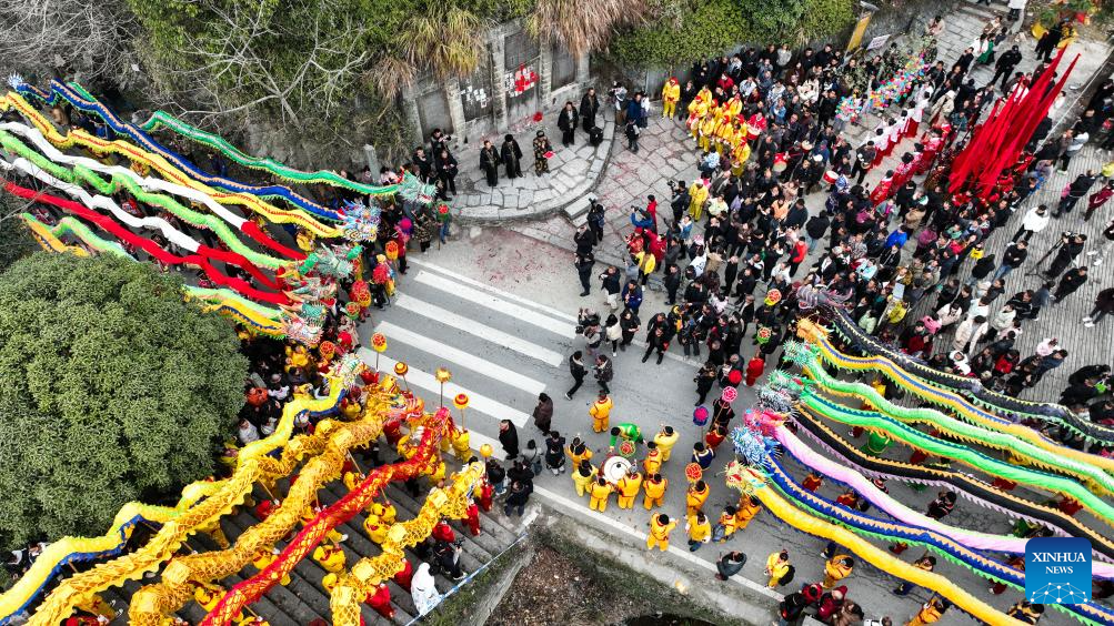 A drone photo shows people performing dragon dance during a parade as part of a Lantern Festival celebration at an ancient town in Jinping County, southwest China's Guizhou Province, Feb. 11, 2025. The celebration featured rich cultural elements of the Miao and Dong ethnic groups, both native to Guizhou. (Xinhua/Yang Wenbin)