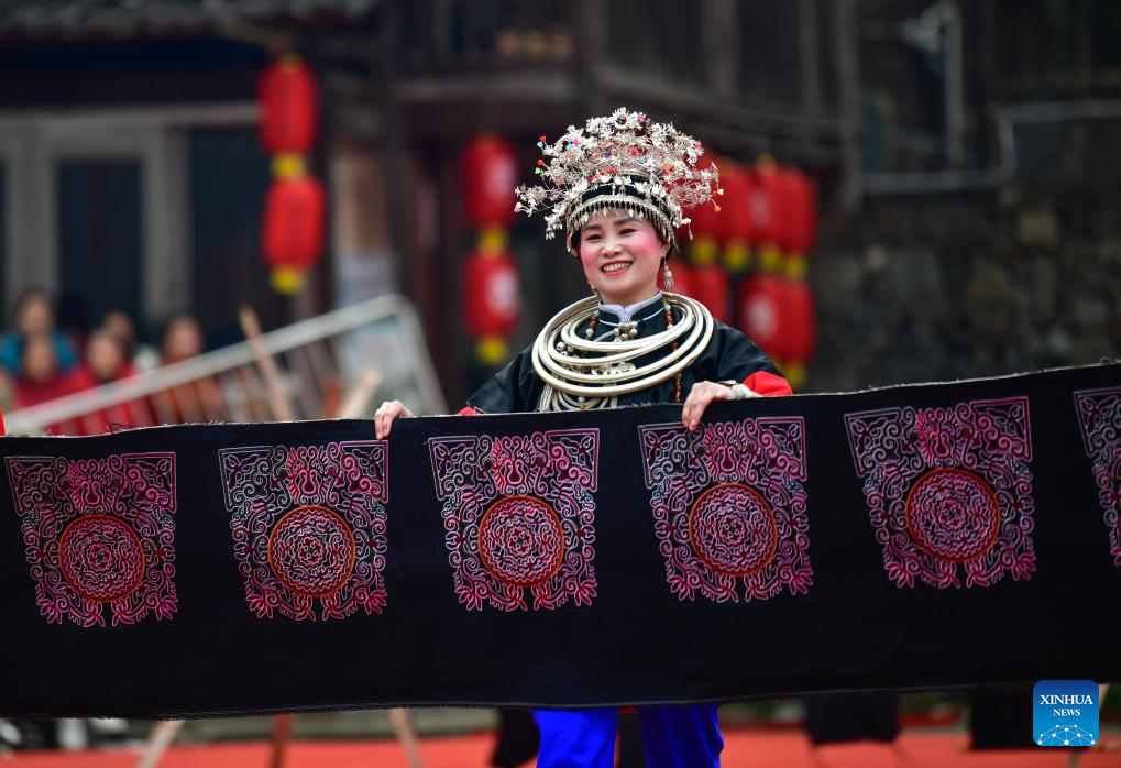 An actress presents a piece of ethnic embroidery work during a Lantern Festival celebration at an ancient town in Jinping County, southwest China's Guizhou Province, Feb. 11, 2025. The celebration featured rich cultural elements of the Miao and Dong ethnic groups, both native to Guizhou. (Xinhua/Yang Wenbin)