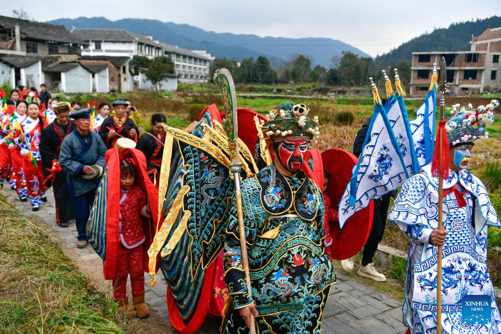 Actors in traditional opera costumes attend a parade during a Lantern Festival celebration at an ancient town in Jinping County, southwest China's Guizhou Province, Feb. 11, 2025. The celebration featured rich cultural elements of the Miao and Dong ethnic groups, both native to Guizhou. (Xinhua/Yang Wenbin)