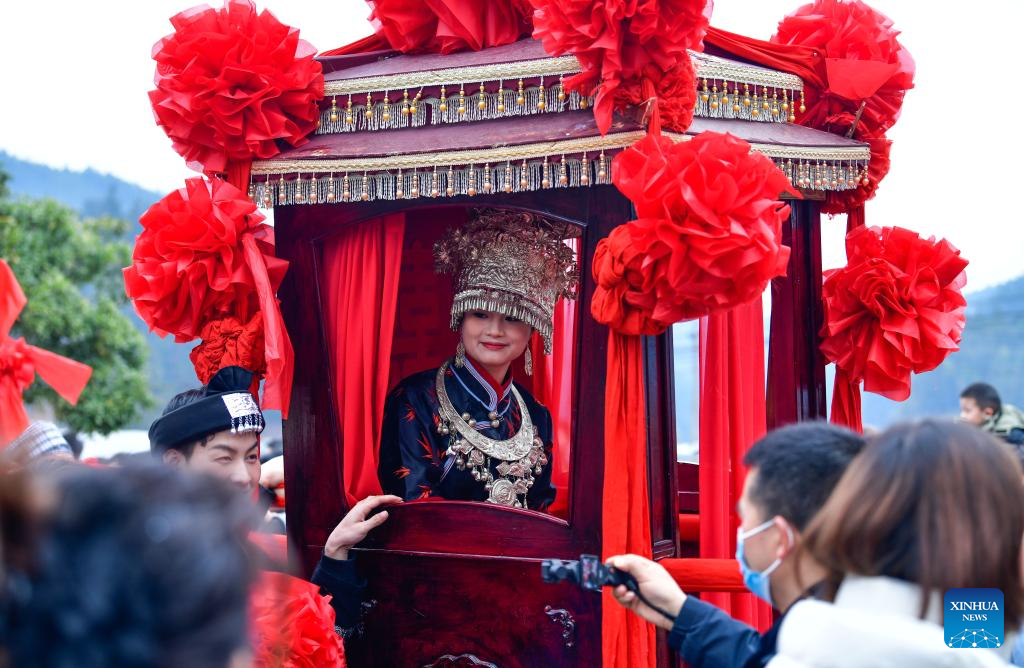 An actress in enthic bride attire is pictured during a Lantern Festival celebration at an ancient town in Jinping County, southwest China's Guizhou Province, Feb. 11, 2025. The celebration featured rich cultural elements of the Miao and Dong ethnic groups, both native to Guizhou. (Xinhua/Yang Wenbin)