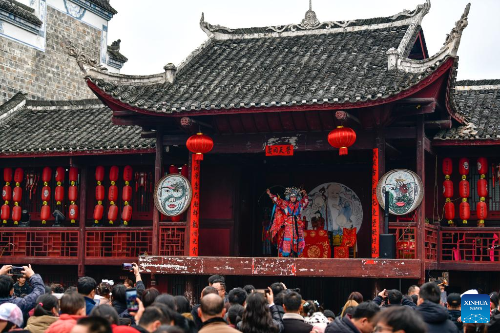 People watch a traditional opera play during a Lantern Festival celebration at an ancient town in Jinping County, southwest China's Guizhou Province, Feb. 11, 2025. The celebration featured rich cultural elements of the Miao and Dong ethnic groups, both native to Guizhou. (Xinhua/Yang Wenbin)