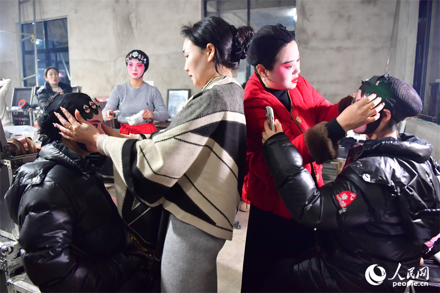 Actresses do the makeup for younger actresses backstage. (People's Daily Online/Shi Yu)