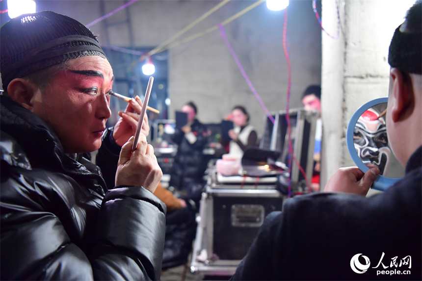 An actor of a Yiyang Opera troupe applies makeup in front of a mirror. (People's Daily Online/Shi Yu)