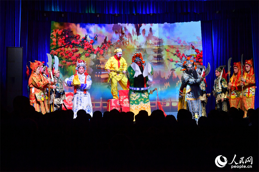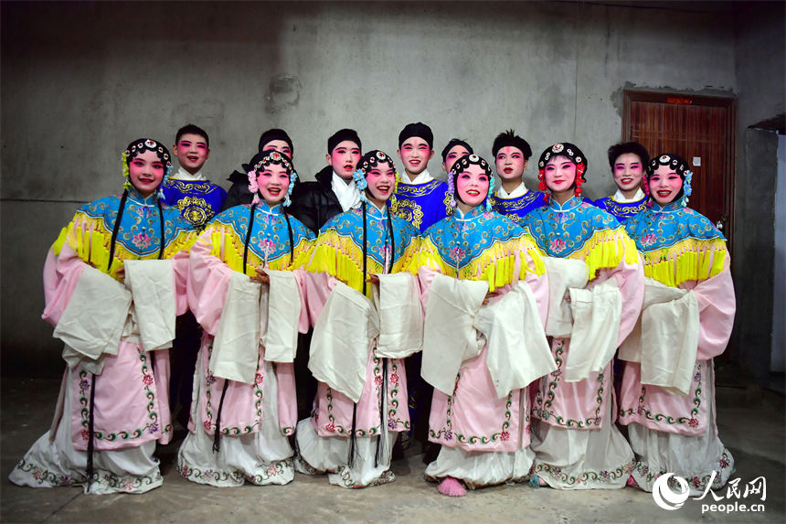 Actresses and actors pose for a group photo after the conclusion of a performance. (People's Daily Online/Shi Yu)
