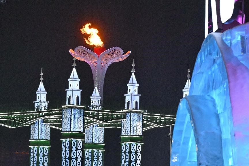 The lit cauldron of the 9th Asian Winter Games is pictured at the Harbin Ice and Snow World Park in Harbin, northeast China's Heilongjiang Province, Feb. 7, 2025. (People's Daily Online/Hu Qingming)