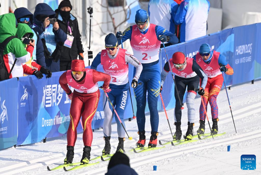 Li Minglin (1st R) of China competes during the Cross-Country Skiing men's 4x7.5km relay match at the 9th Asian Winter Games in Yabuli, northeast China's Heilongjiang Province, Feb. 12, 2025. (Xinhua/Wu Zhizun)
