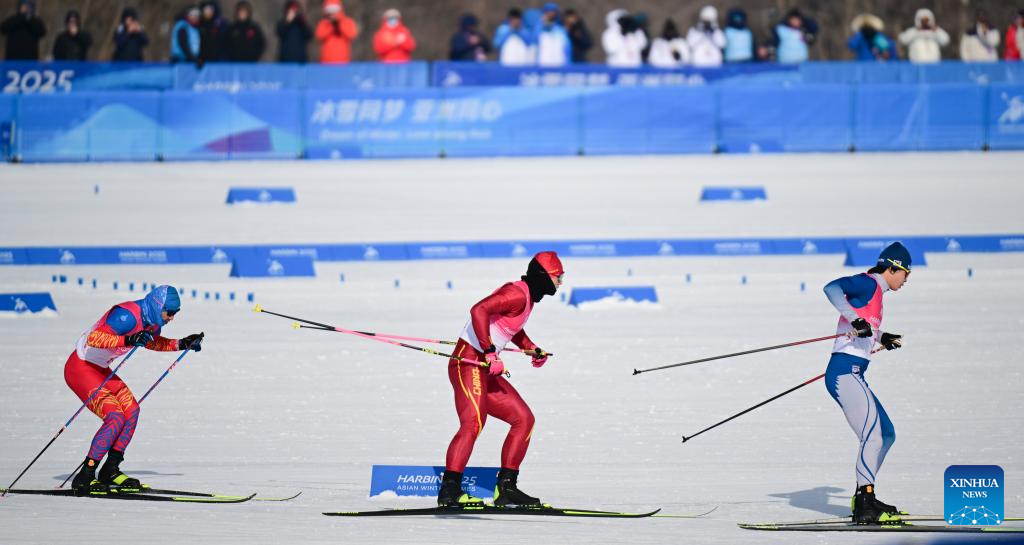 Li Minglin (C) of China competes during the Cross-Country Skiing men's 4x7.5km relay match at the 9th Asian Winter Games in Yabuli, northeast China's Heilongjiang Province, Feb. 12, 2025. (Xinhua/Zhang Long)