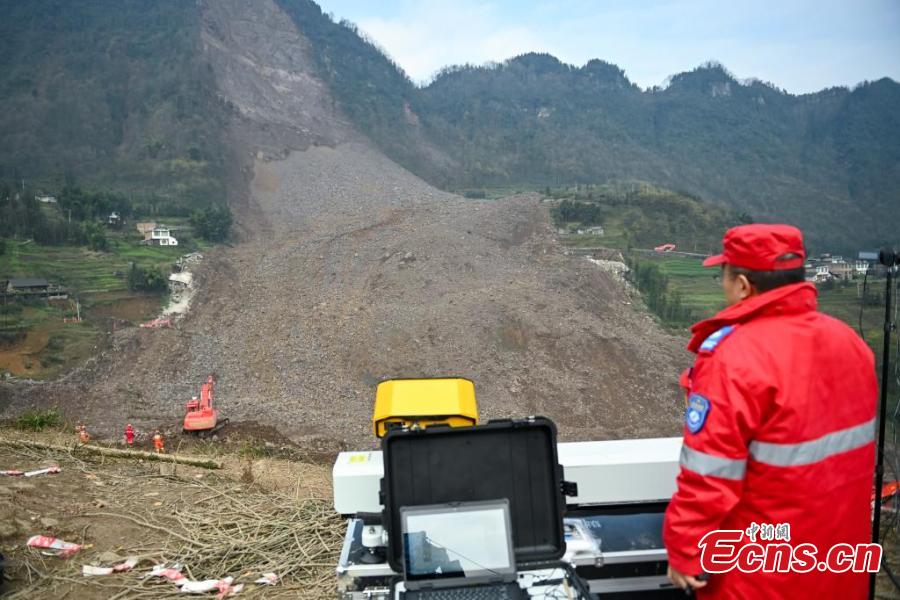 A rescuer operates a real-time radar monitoring device to search for missing people at the rescue site in Junlian County in the city of Yibin, southwest China's Sichuan Province, Feb. 11, 2025. (China News Service/Liu Zhongjun)