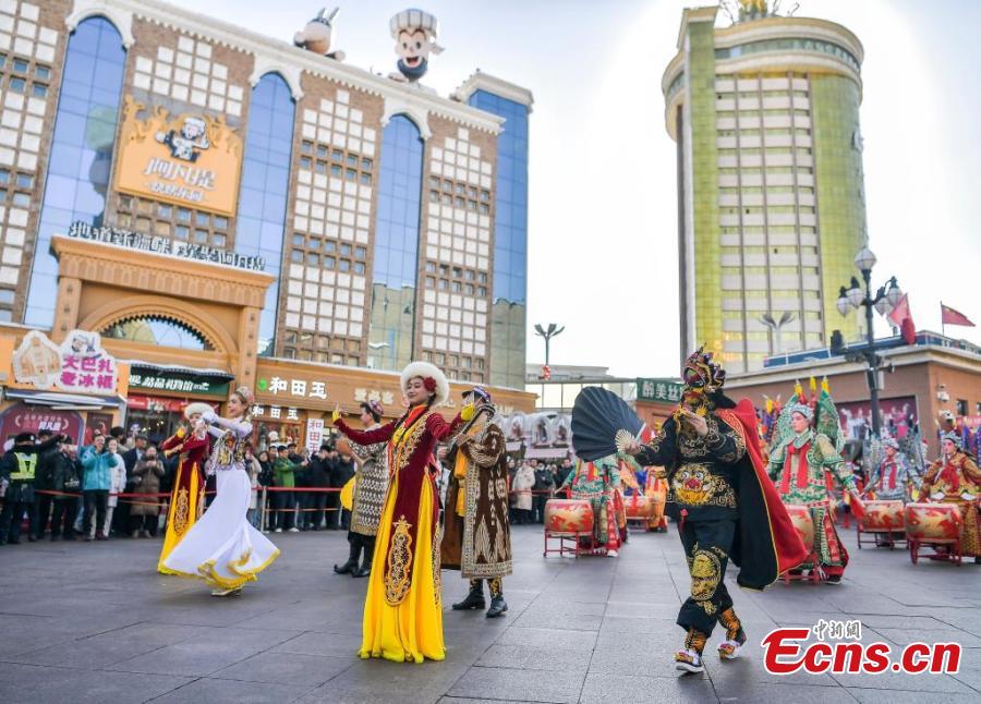 People perform during a Shehuo gala at the International Grand Bazaar in Urumqi, northwest China's Xinjiang Uygur Autonomous Region, Feb. 11, 2025. (China News Service/Liu Xin)