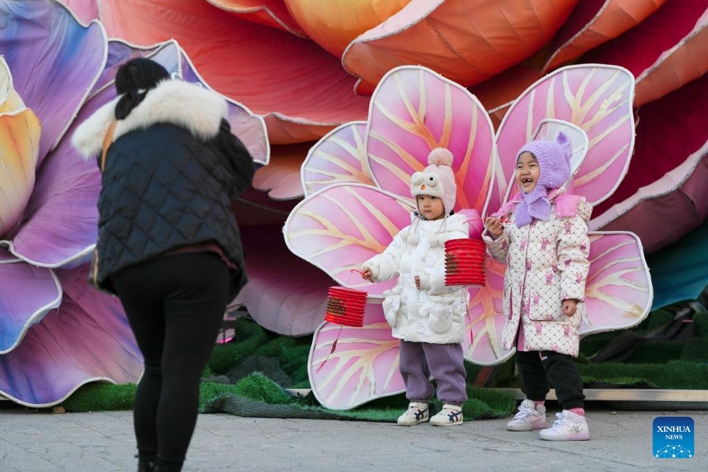 Children pose for photos during a lantern fair at Beijing Garden Expo Park in Beijing, capital of China, Feb. 10, 2025. Two major lantern fairs are held in Beijing to mark the Lantern Festival, which falls on Wednesday. (Xinhua/Ju Huanzong)