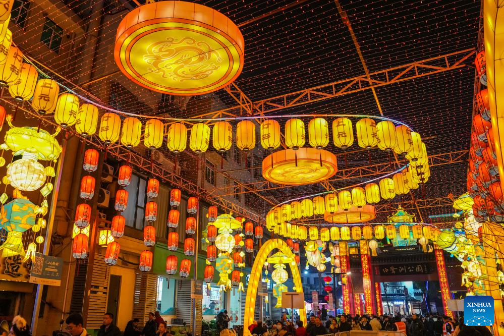 People enjoy lanterns at Bailuzhou Park in Nanjing, east China's Jiangsu Province, Feb. 12, 2025. Various activities were held across China to celebrate the Lantern Festival, which falls on the fifteenth day of the first month of the Chinese lunar calendar. (Xinhua/Li Bo)