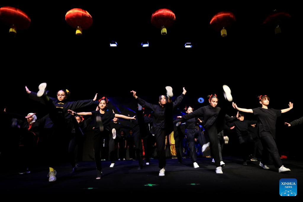 People give a Kung Fu performance during a Lantern Festival celebration hosted by the China Cultural Center in Amman, Jordan, on Feb. 12, 2025. The China Cultural Center in Amman hosted the Lantern Festival celebration on Wednesday, marking the end of Chinese Spring Festival festivities with traditional performances and cultural exchanges. (Photo by Mohammad Abu Ghosh/Xinhua)