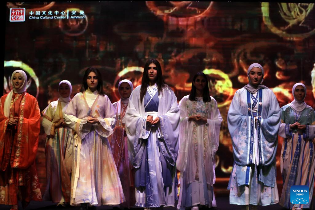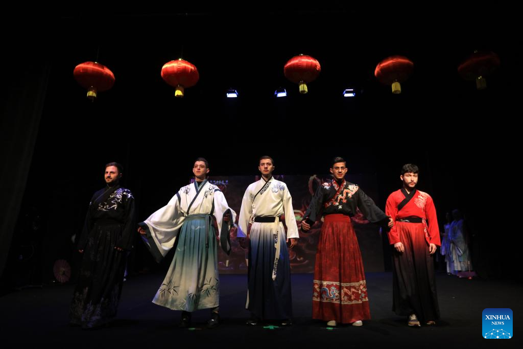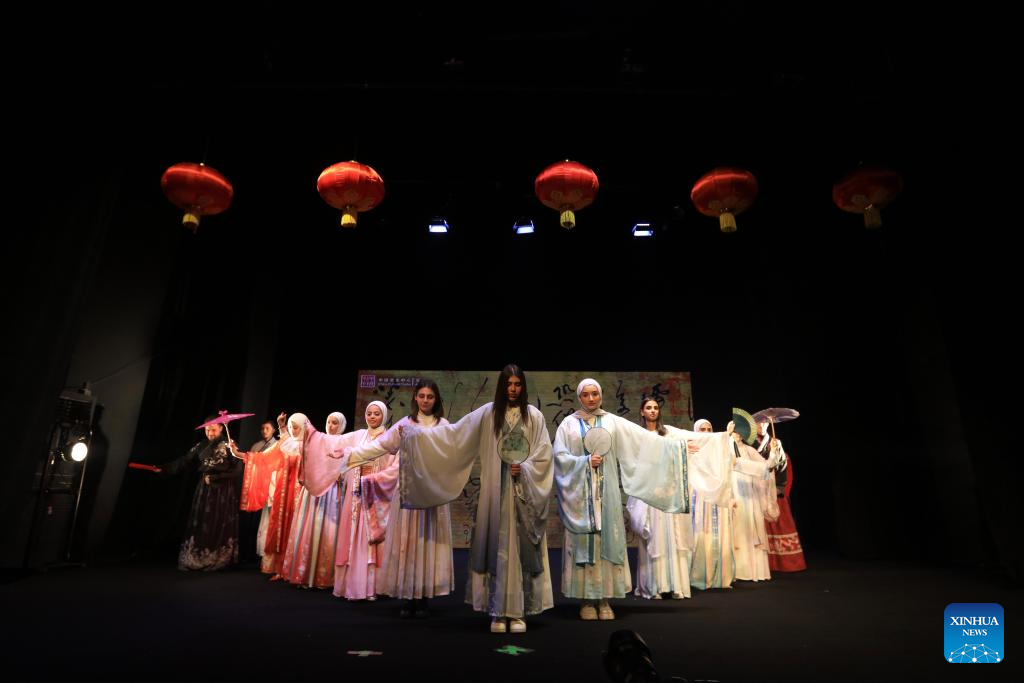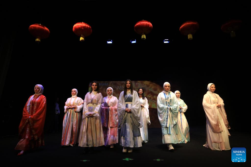 People participate in a Hanfu show during a Lantern Festival celebration hosted by the China Cultural Center in Amman, Jordan, on Feb. 12, 2025. The China Cultural Center in Amman hosted the Lantern Festival celebration on Wednesday, marking the end of Chinese Spring Festival festivities with traditional performances and cultural exchanges. (Photo by Mohammad Abu Ghosh/Xinhua)