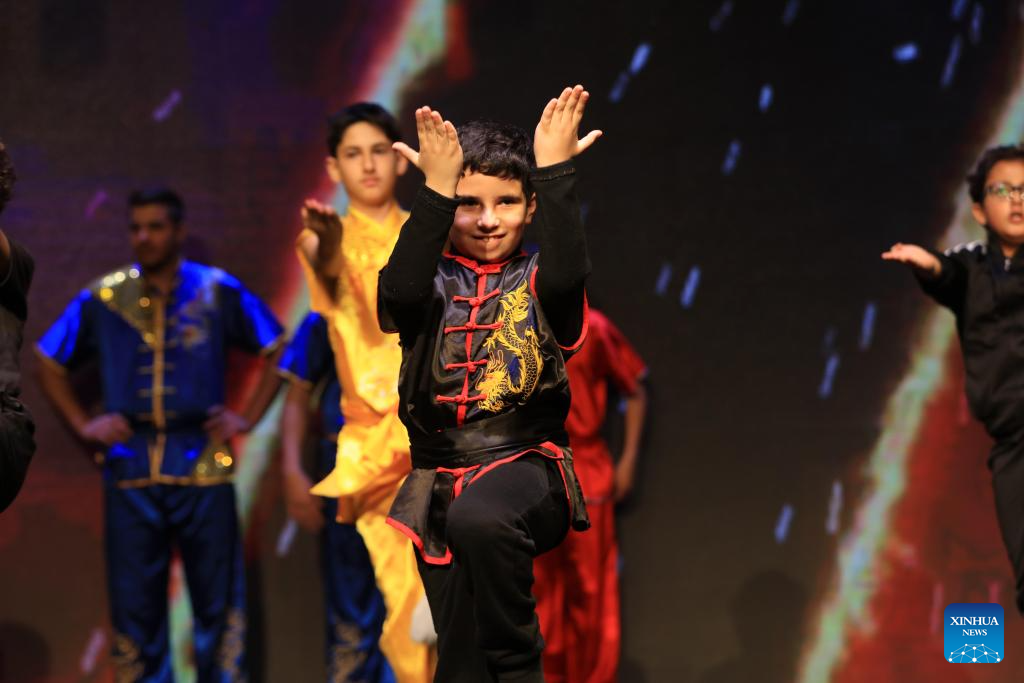 A boy gives a Kung Fu performance during a Lantern Festival celebration hosted by the China Cultural Center in Amman, Jordan, on Feb. 12, 2025. The China Cultural Center in Amman hosted the Lantern Festival celebration on Wednesday, marking the end of Chinese Spring Festival festivities with traditional performances and cultural exchanges. (Photo by Mohammad Abu Ghosh/Xinhua)