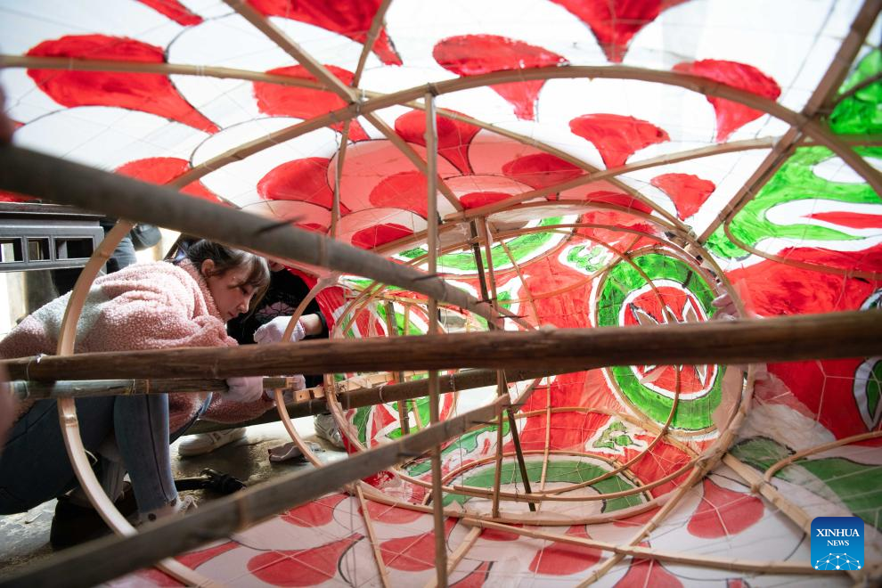 A villager makes fish-shaped lanterns in Wangmantian Village of Xitou Town in Shexian County, Huangshan City of east China's Anhui Province, Feb. 10, 2025. Local villagers have the tradition to make fish-shaped lanterns to pray for harvest and good fortune and parade with them cheerfully around the Lantern Festival, which falls on the 15th day of the first month of the Chinese lunar calendar, or Feb. 12 this year. (Photo by Shi Yalei/Xinhua)