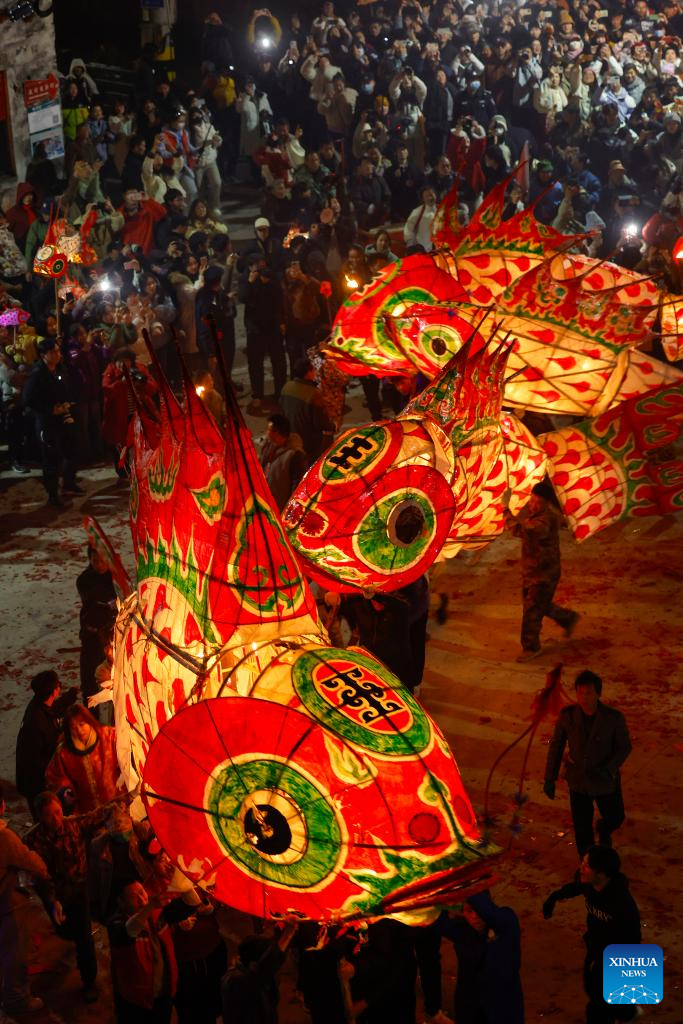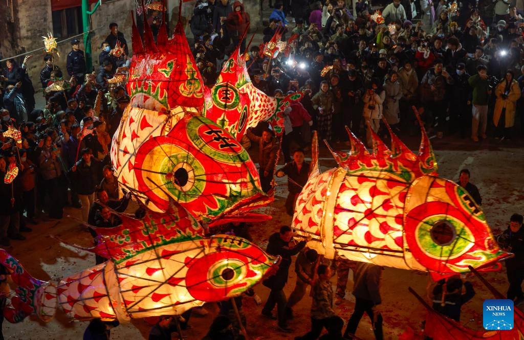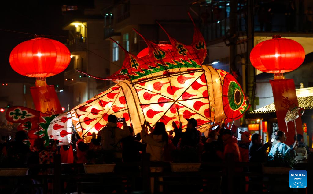 Villagers parade with fish-shaped lanterns in Wangmantian Village of Xitou Town in Shexian County, Huangshan City of east China's Anhui Province, Feb. 10, 2025. Local villagers have the tradition to make fish-shaped lanterns to pray for harvest and good fortune and parade with them cheerfully around the Lantern Festival, which falls on the 15th day of the first month of the Chinese lunar calendar, or Feb. 12 this year. (Photo by Shi Yalei/Xinhua)