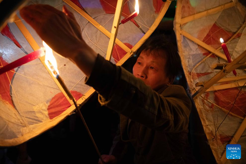 A villager ignites the candles inside the fish-shaped lanterns in Wangmantian Village of Xitou Town in Shexian County, Huangshan City of east China's Anhui Province, Feb. 10, 2025. Local villagers have the tradition to make fish-shaped lanterns to pray for harvest and good fortune and parade with them cheerfully around the Lantern Festival, which falls on the 15th day of the first month of the Chinese lunar calendar, or Feb. 12 this year. (Xinhua/Zhang Duan)