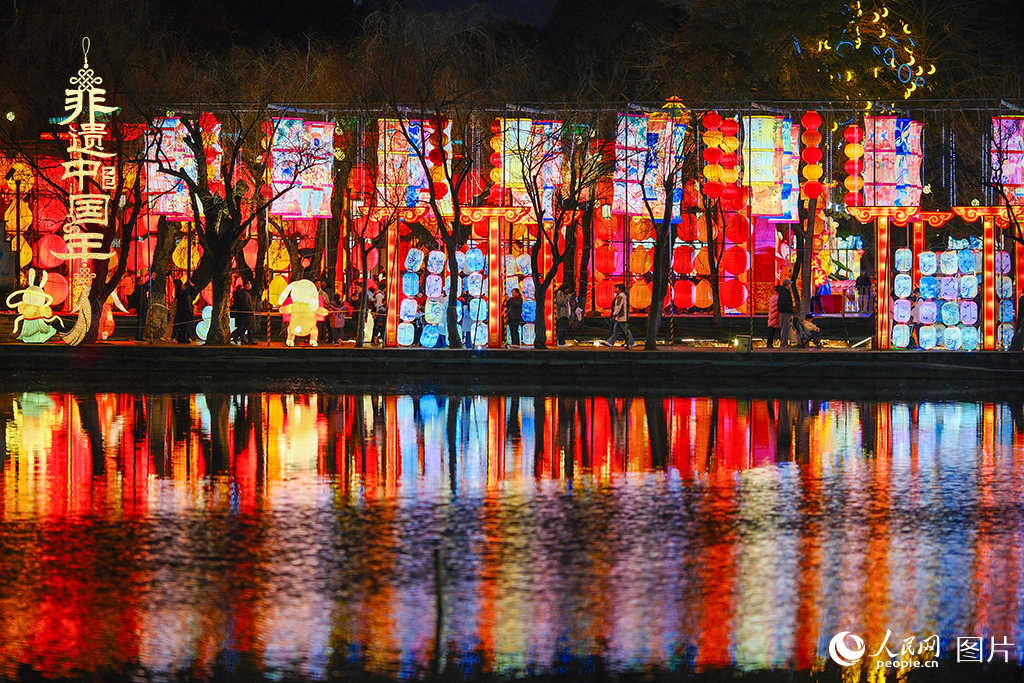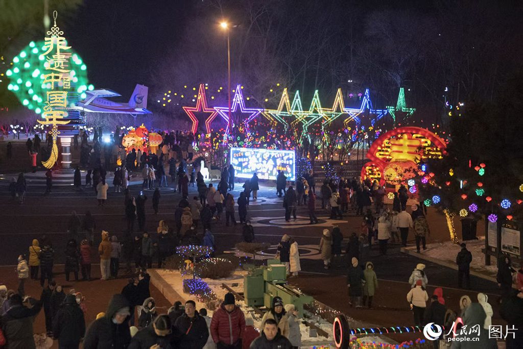 People gather in a park in Harbin, northeast China's Heilongjiang Province, to admire colorful lanterns and enjoy the traditional lantern riddle game, Feb. 11, 2025. (People's Daily/Xu Chenglong)