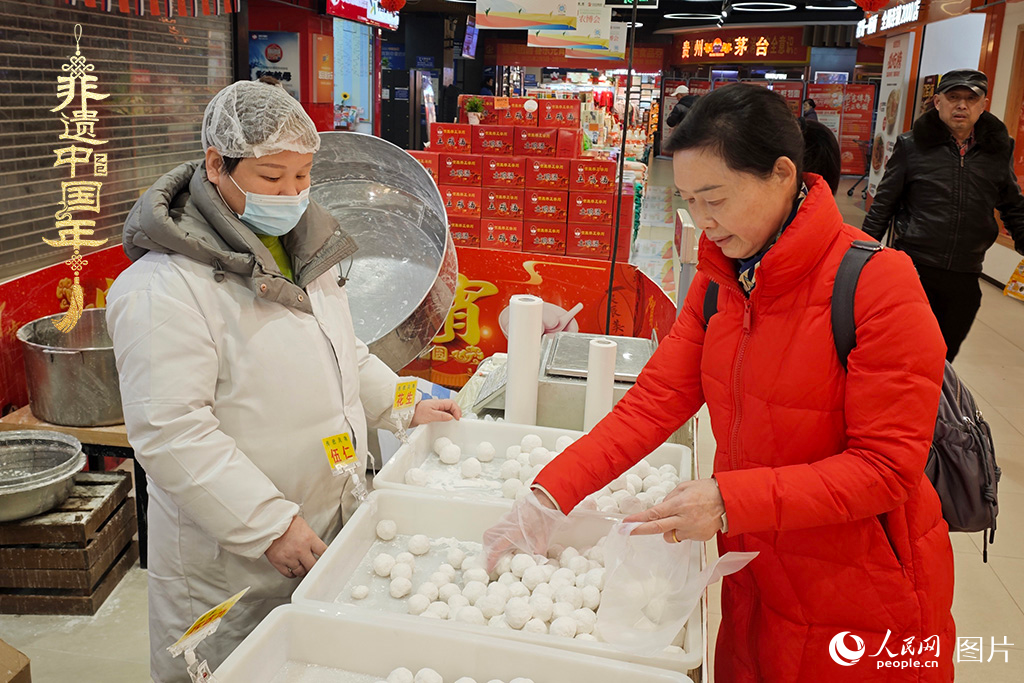A woman shops for Tangyuan, sweet glutinous rice dumplings usually eaten during the Lantern Festival, at a shopping mall in Wuhan, central China's Hubei Province, Feb. 10, 2025. (People's Daily Online/Zhang Pei)