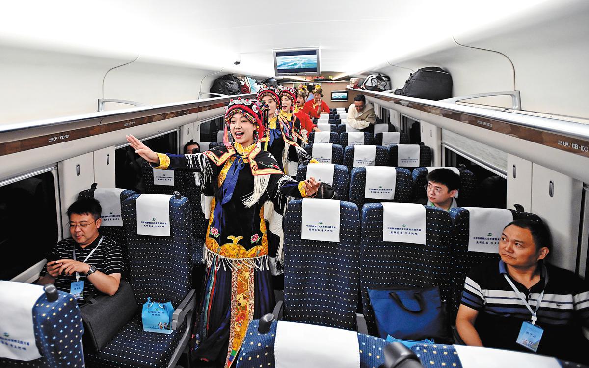A performance is staged on the inaugural train to Jiuzhaigou scenic area as the railway opens on Aug 30. (An Yuan/China News Services)