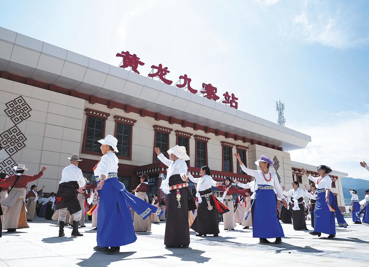 Residents dance at Huanglong Jiuzhai Railway Station at its opening on Aug 30. (Jiang Hongjing/Xinhua)