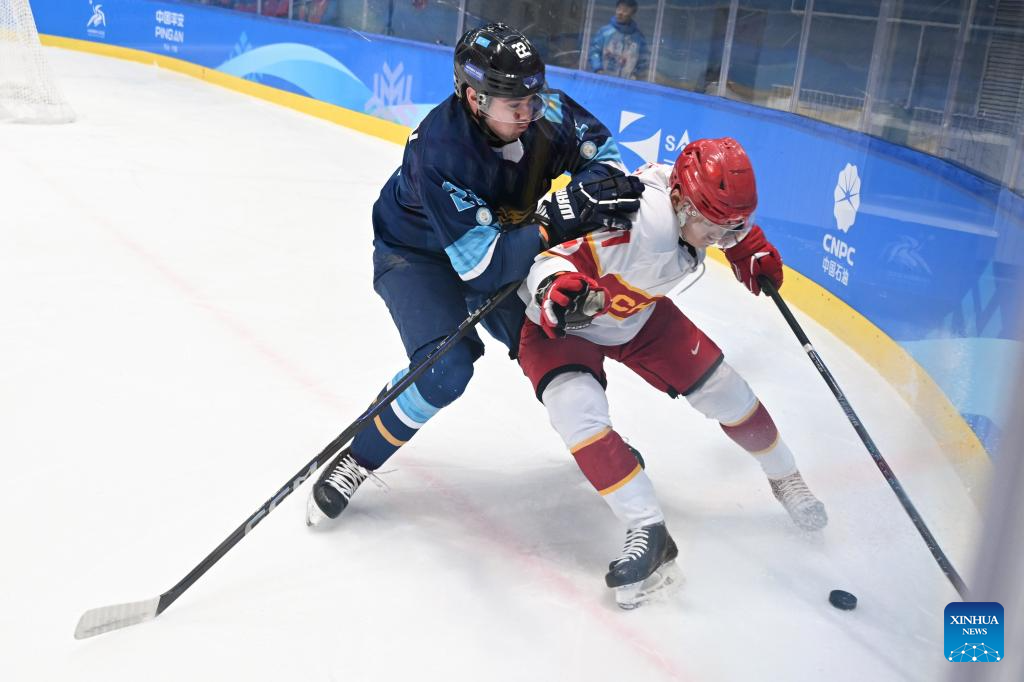 Han Yuhang (R) of China vies with Kirill Panyukov of Kazakhstan during the men's ice hockey play-offs semifinal match between Kazakhstan and China at 9th Asian Winter Games in Harbin, northeast China's Heilongjiang Province, on Feb. 13, 2025. (Xinhua/Li Jianan)